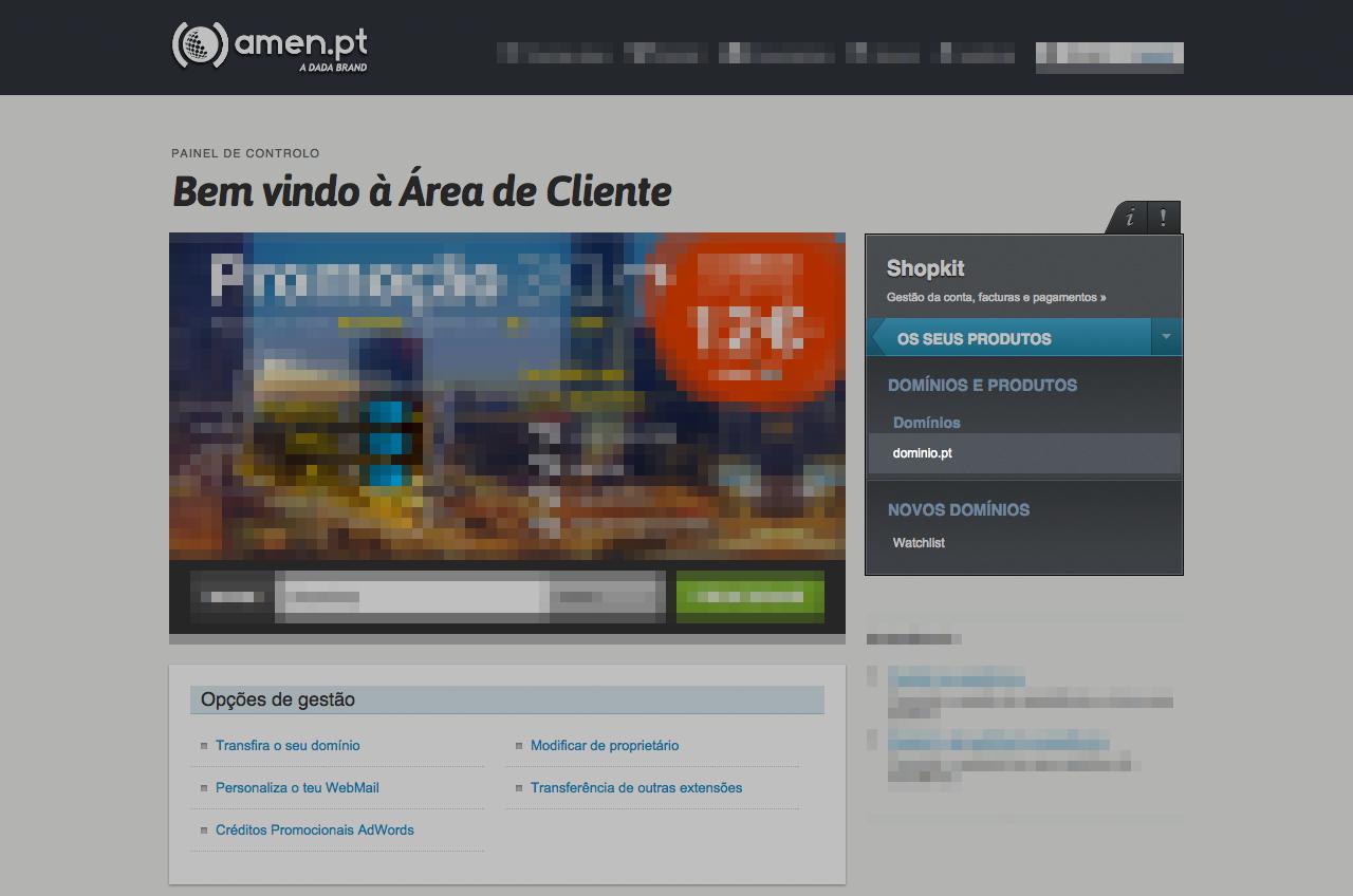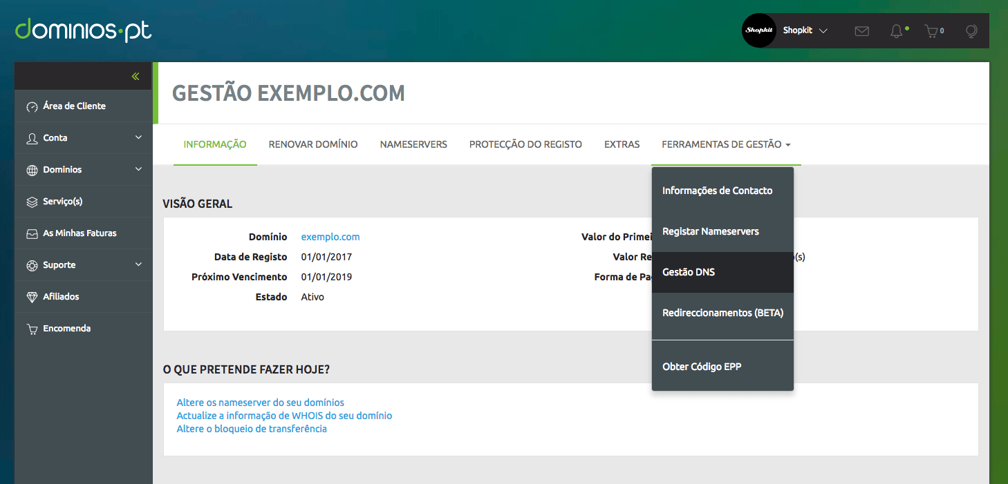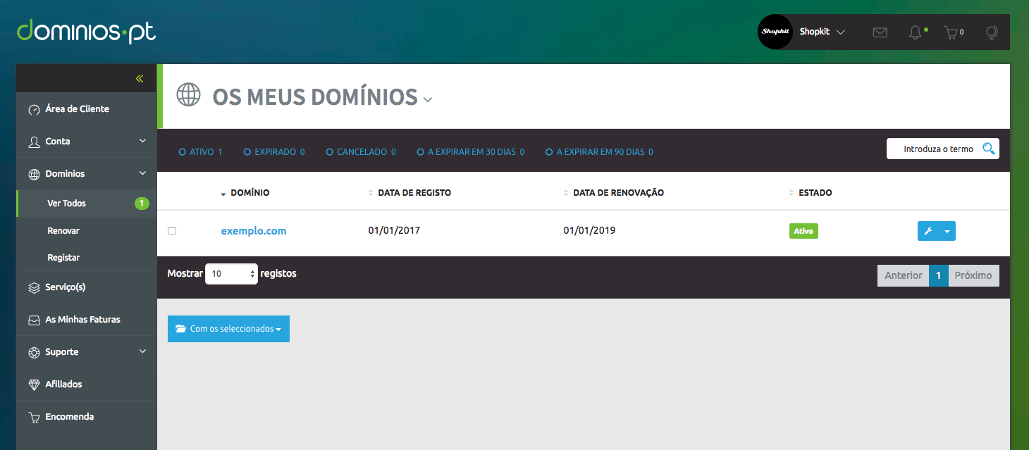 Com a transferência de domínio, o mesmo fica alojado na Shopkit.