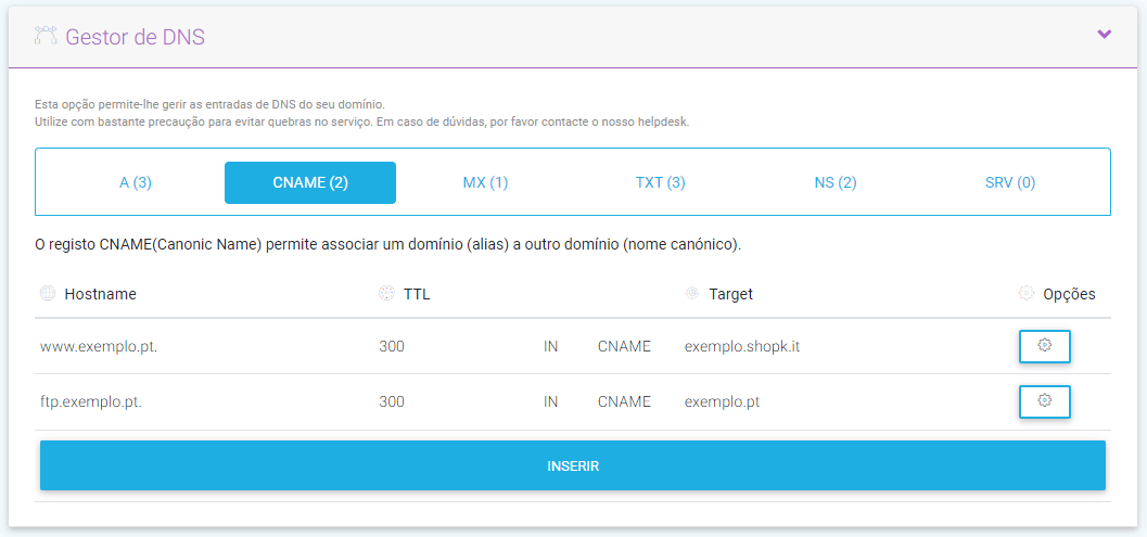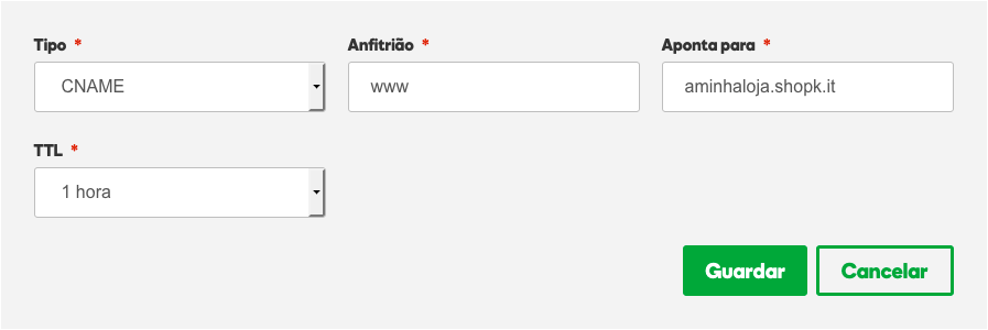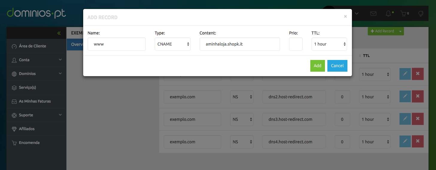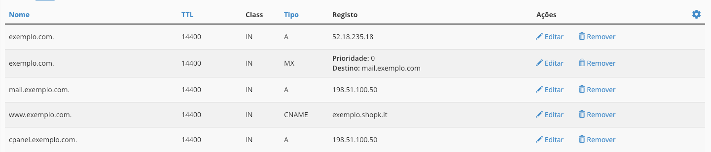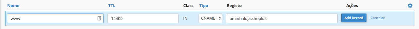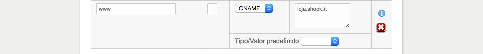 Por exemplo, se o teu subdomínio Shopkit for: lojaderoupa.shopk.it deves ter uma entrada CNAME de www para lojaderoupa.shopk.it