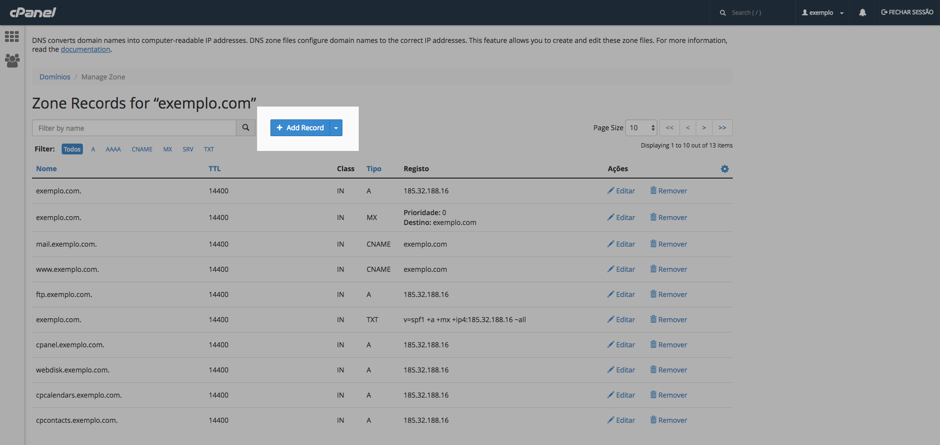 Caso já exista um record com www podes editar ou eliminar o existente.