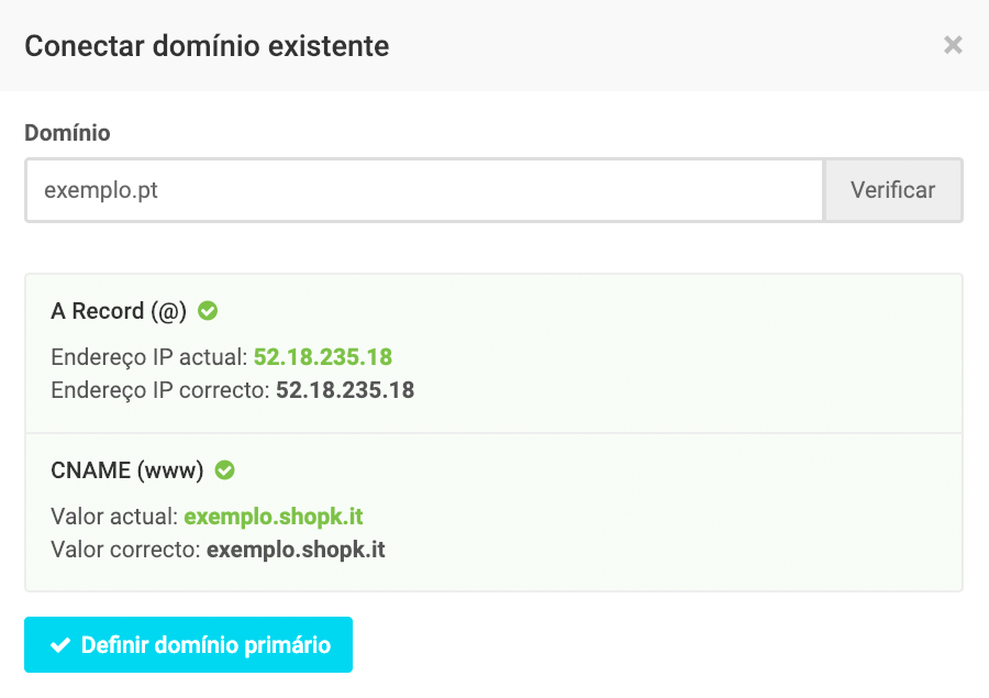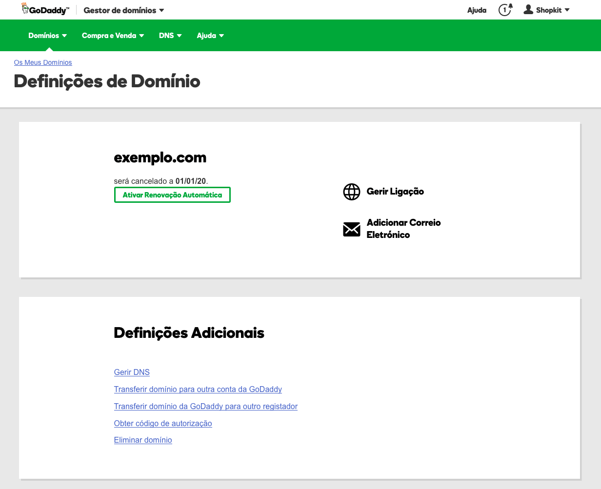 Esta opção, que encontras disponível no menu Configurações / Domínios, permite que possas configurar um domínio próprio que já tenhas registado e que esteja alojado num serviço externo à Shopkit.