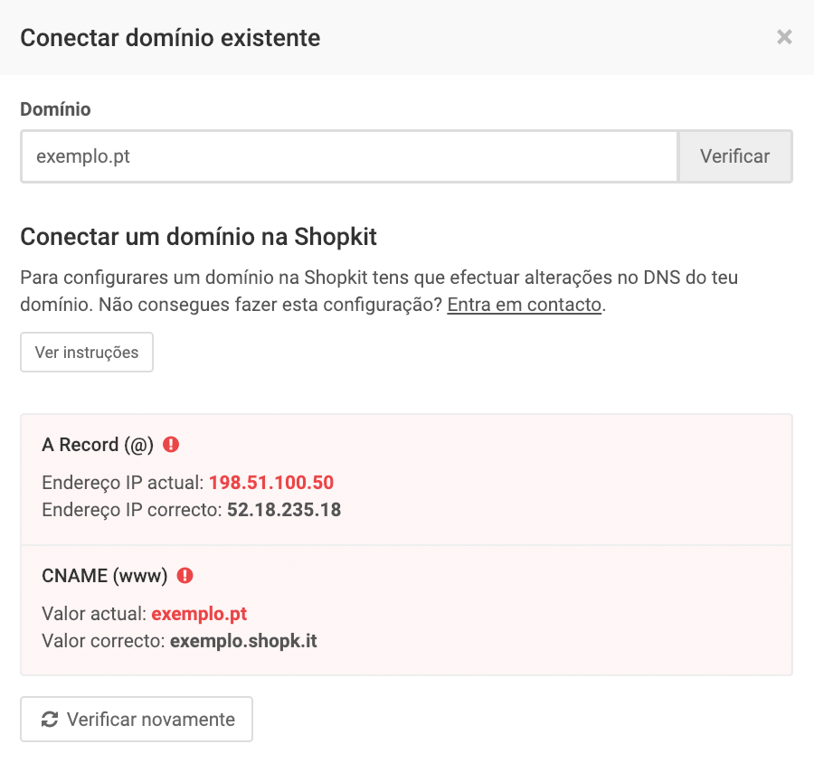 Ao utilizares esta opção e conectares o domínio próprio, podes verificar as instruções necessárias para a configuração:
