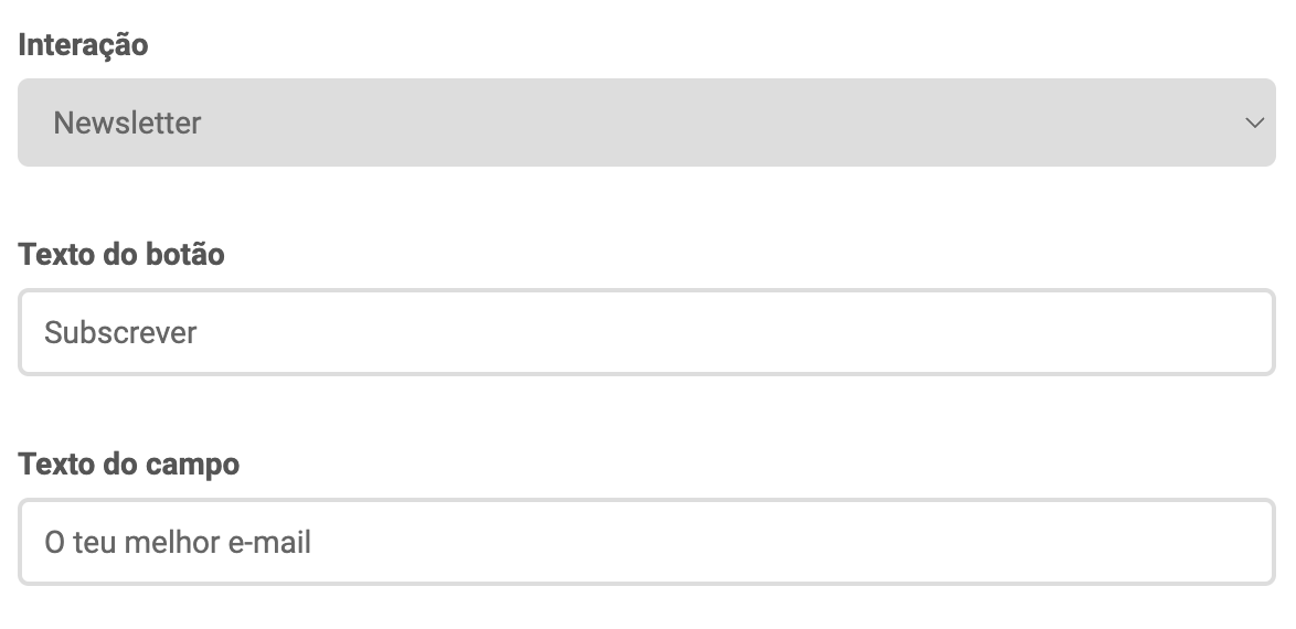 Se optares por adicionar uma interação do tipo Newsletter, podes personalizar o nome do botão e o texto do campo de formulário onde é adicionado o e-mail. Caso escolhas o tipo Botão, podes personalizar o nome do botão e definir qual o link que fica hiperligado.