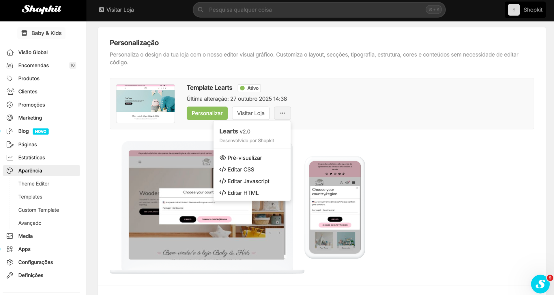 No menu Aparência / Theme Editor é possível verificares qual o template que tens atualmente aplicado na loja, a data da última alteração e uma pré-visualização da tua loja em desktop e mobile.