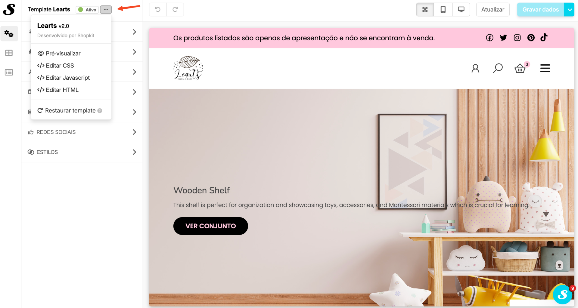 O Shopkit Theme Editor está dividido em 3 menus principais: