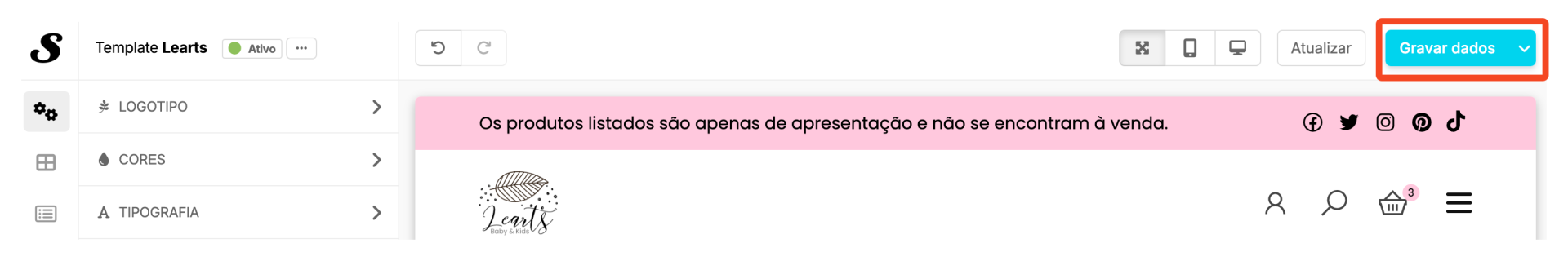 Ao selecionares um estilo este é aplicado à pré-visualização do template. Para aplicares o estilo à loja deves clicar, posteriormente, em Gravar dados.