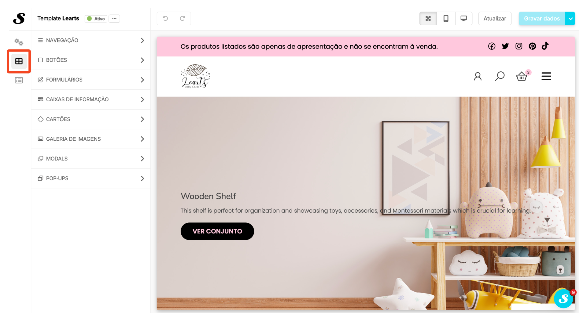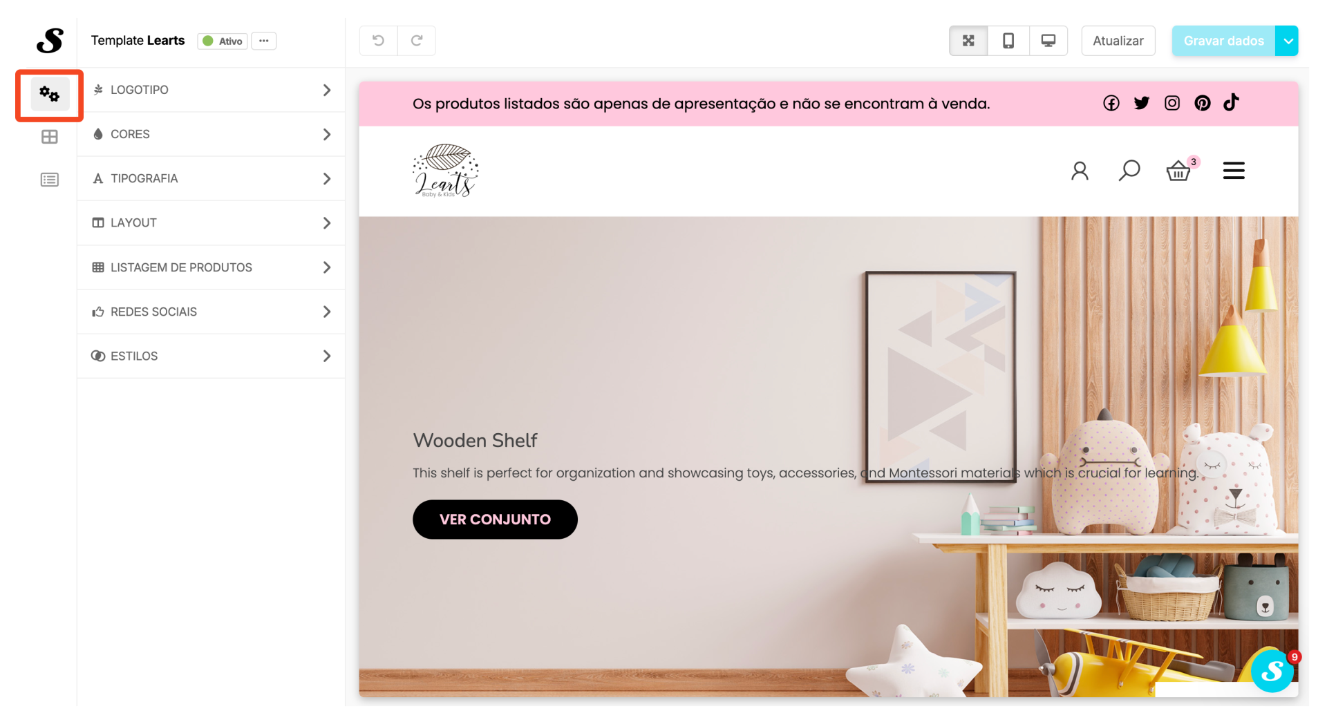 Icones da loja: Personaliza os ícones da tua loja, como o carrinho de compras, redes sociais e outros através da biblioteca disponível.