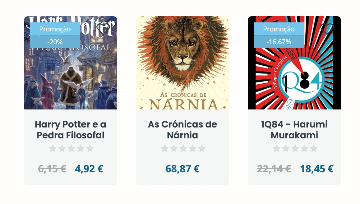 Os cartões são componentes de design que agrupam informações relacionadas num elemento visual retangular, semelhante a um cartão. Os cartões podem conter diferentes tipos de conteúdo, como imagens, textos, botões e links. Um exemplo de cartão são as informações de produtos que surgem agrupadas nas listagens de produtos.