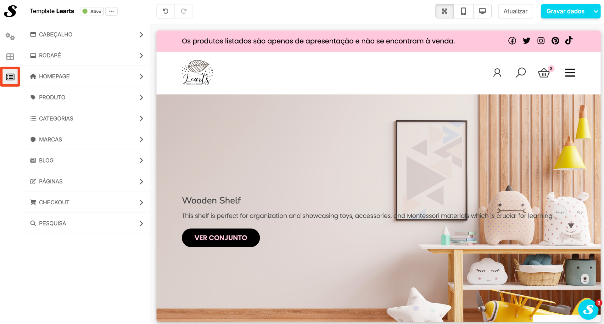 Neste menu é possível efetuar algumas configurações relativas a secções e páginas específicas da loja, como são exemplo a homepage e o carrinho de compras.