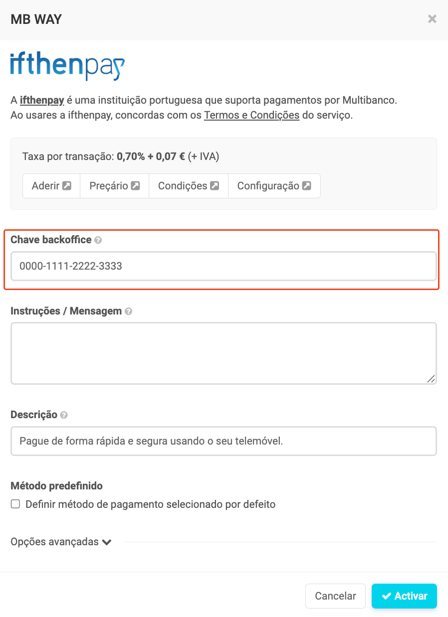 Coloca a Chave backoffice da ifthenpay no respetivo campo. O dado necessário para configurar este método de pagamento tem o formato XXXX-XXXX-XXXX-XXXX.