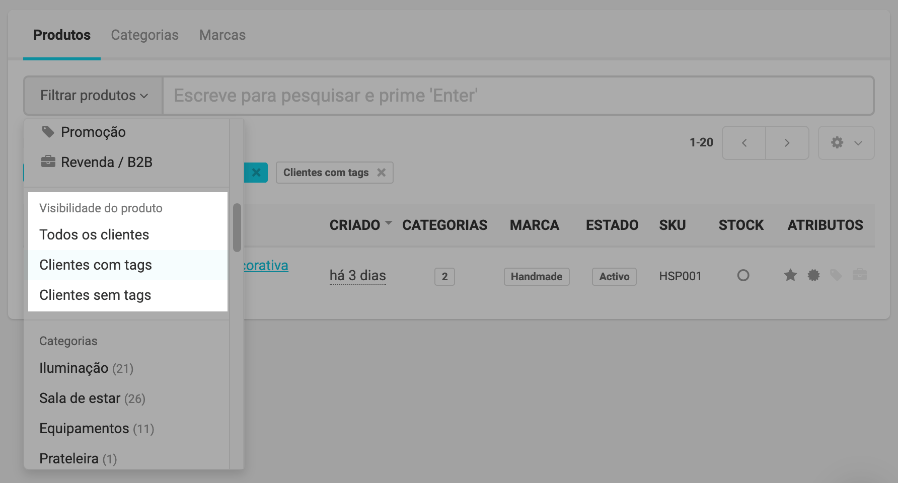 No menu Produtos podes usar os filtros para segmentar a listagem de acordo com a visibilidade. Podes aplicar os filtros: Todos os clientes, Clientes com tags e Clientes sem tags.