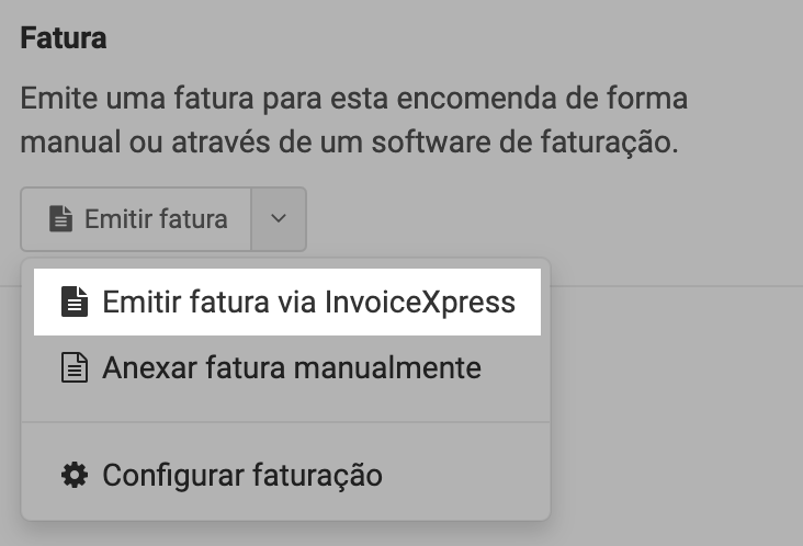 Se optares por integrar um software de faturação, mas decidires não automatizar a emissão das faturas, pode fazê-lo manualmente a partir do detalhe de uma encomenda. Os passos necessários são os seguintes:
