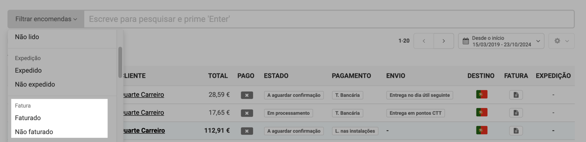 Na vista geral do menu Encomendas podes aplicar filtros relacionados com a faturação para segmentar a listagem de encomendas apresentada: