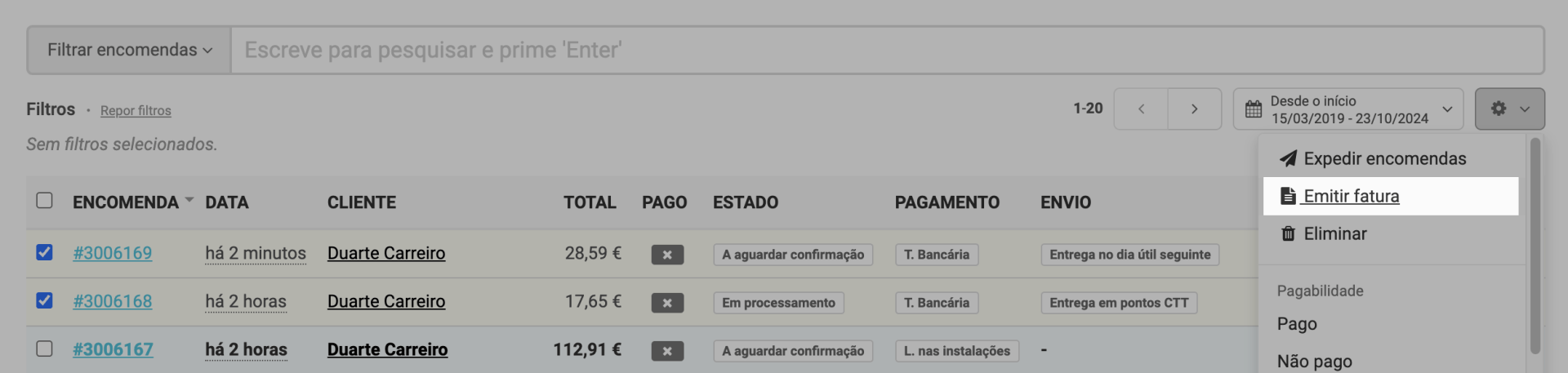 Para tal, basta selecionares as encomendas que pretendes e utilizares a opção Emitir fatura, que encontras na roda dentada (⚙️).
