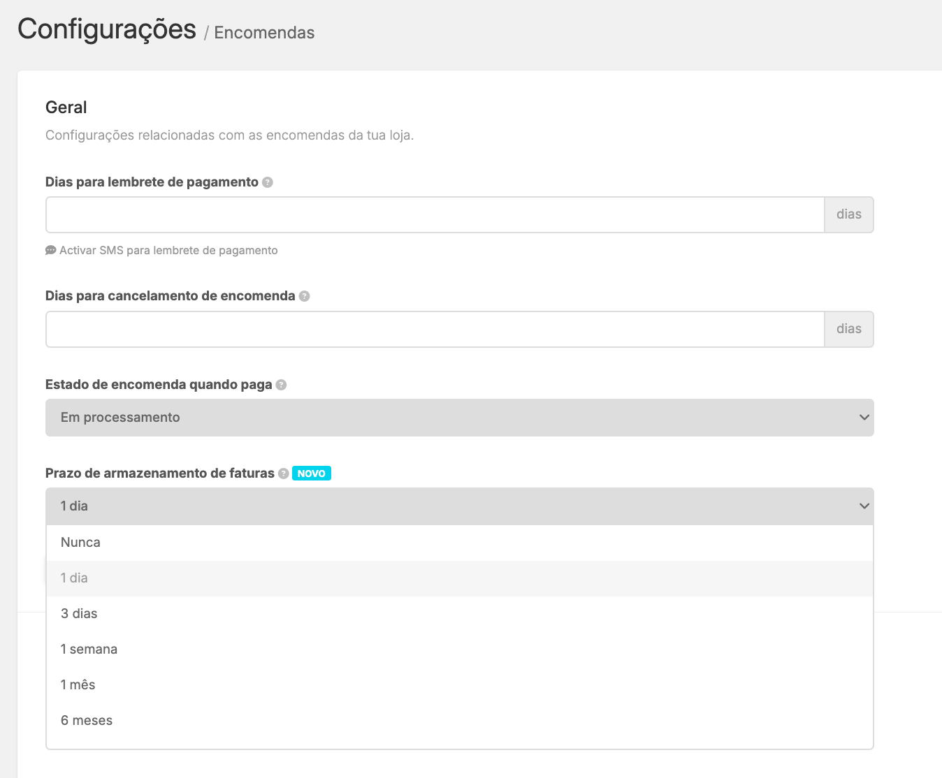No menu Configurações / Encomendas, no campo Prazo de armazenamento de faturas podes definir durante quanto tempo as faturas ficam disponíveis para consulta.
