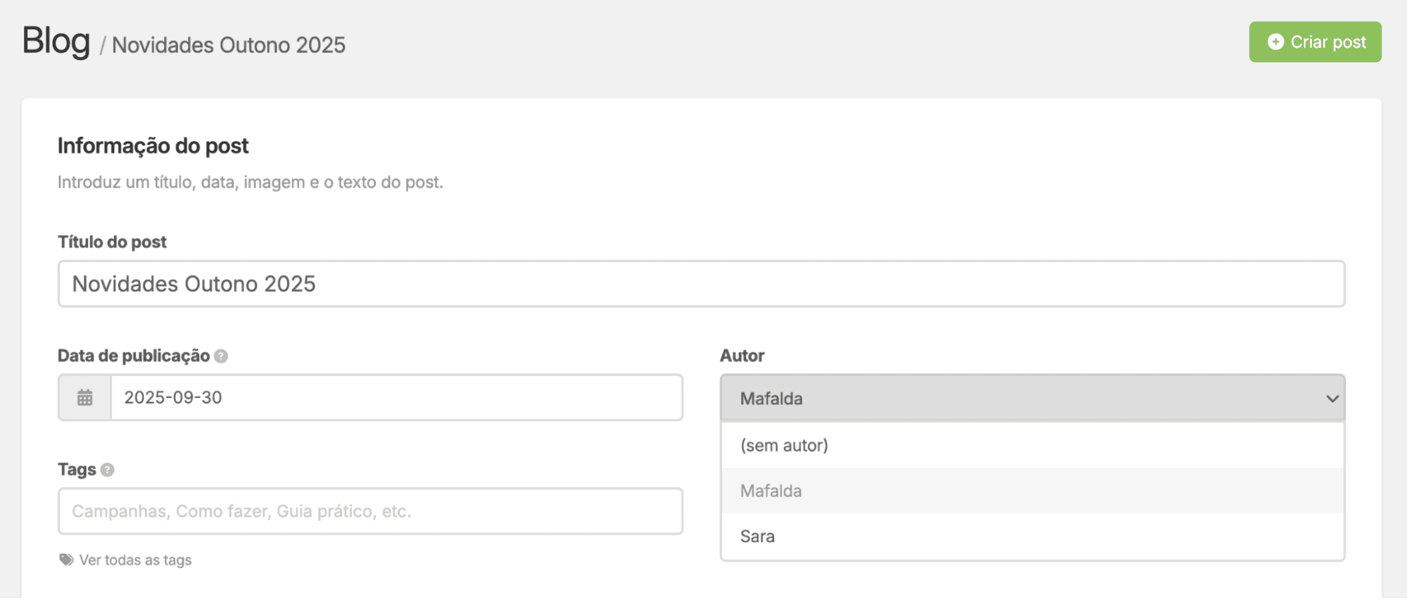 Neste campo podes escolher quem é o autor de cada post de blog. Os autores são os utilizadores que podem ser criados no menu Definições / Utilizadores. Podes saber mais sobre a criação e gestão de utilizadores no nosso artigo de suporte.