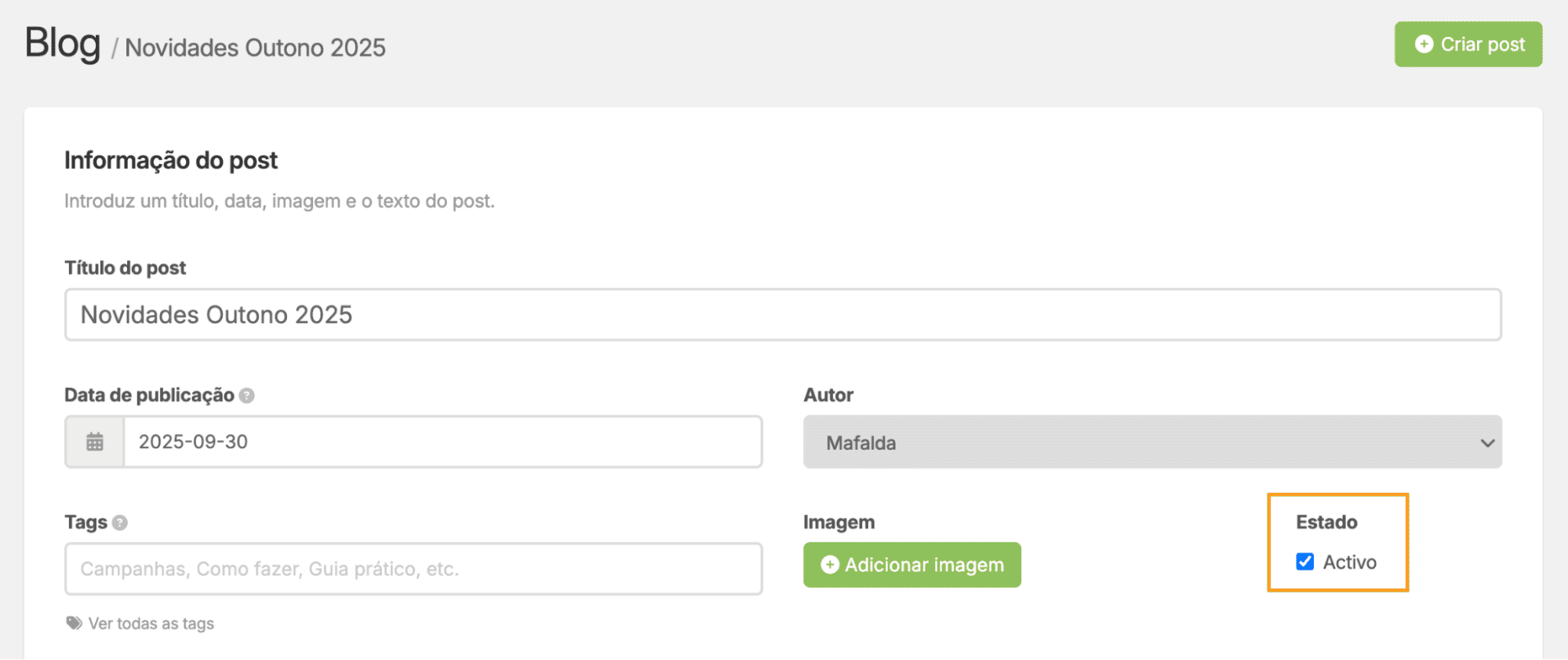 Por defeito, a opção Activo está selecionada, ao gravares dados, o post é criado e fica disponível na tua loja. Se não pretenderes que o post fique visível, deves desativar esta opção.