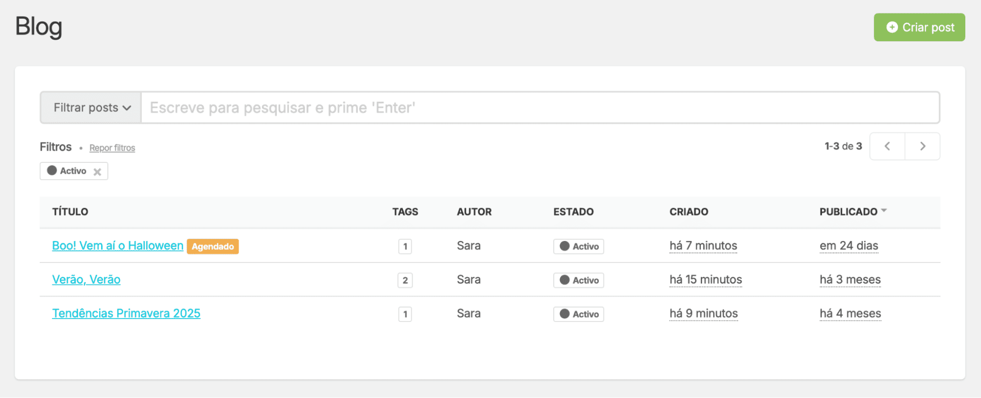 No menu Blog podes criar posts de blog e geri-los de forma simples e fácil. Ao acederes a este menu, podes consultar todos os posts que já criaste e criar novos através da opção + Criar post, visível no canto superior direito.