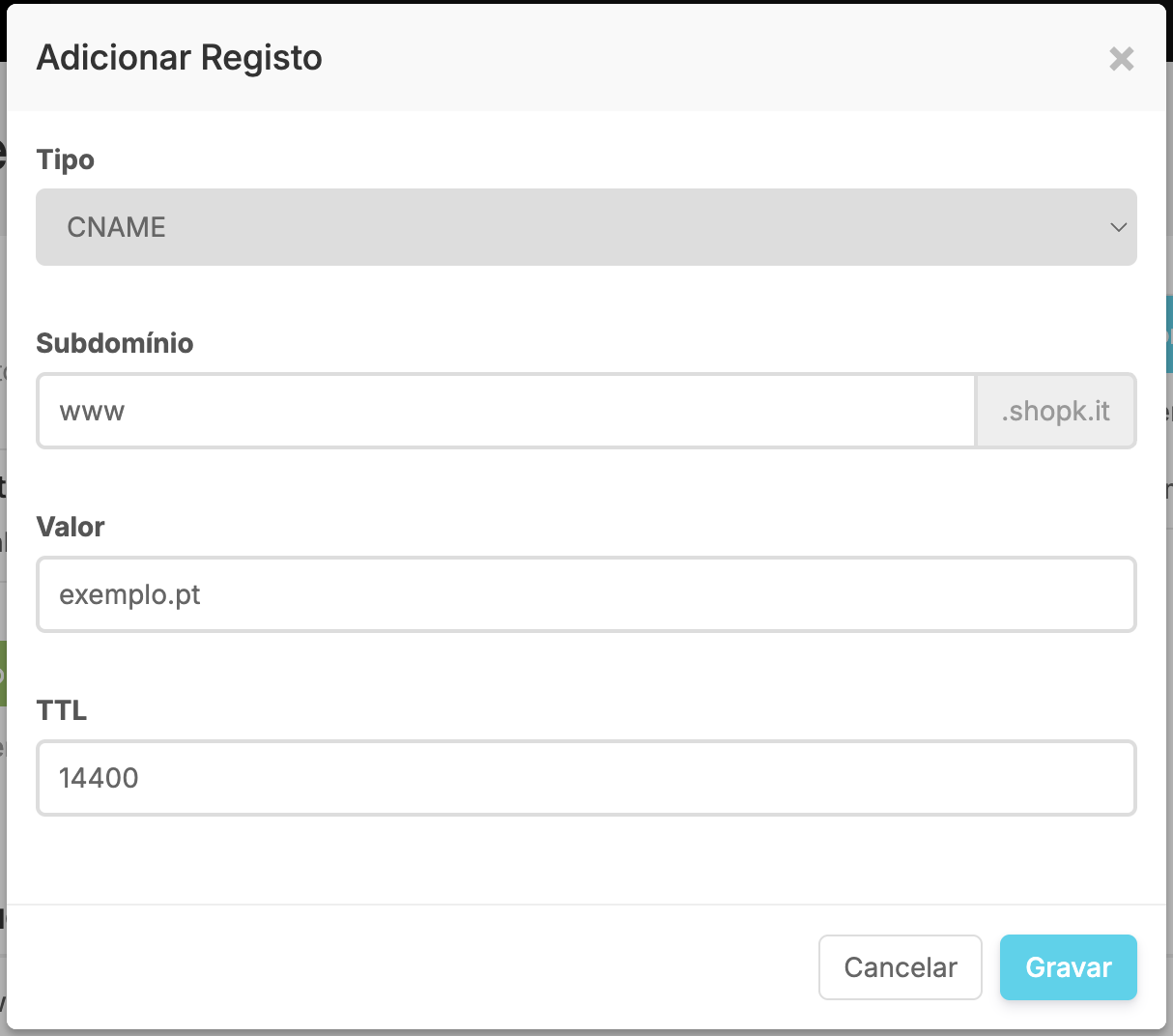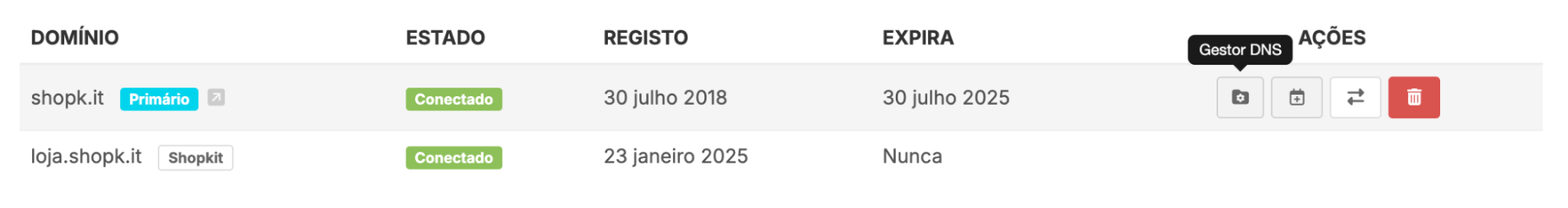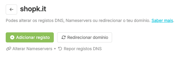 O Gestor de DNS está disponível apenas para domínios próprios alojados na Shopkit.