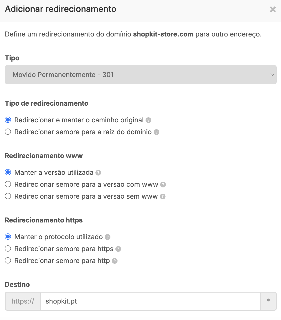 Com esta opção, os clientes são redirecionados para o novo domínio, mantendo o mesmo caminho/URL.