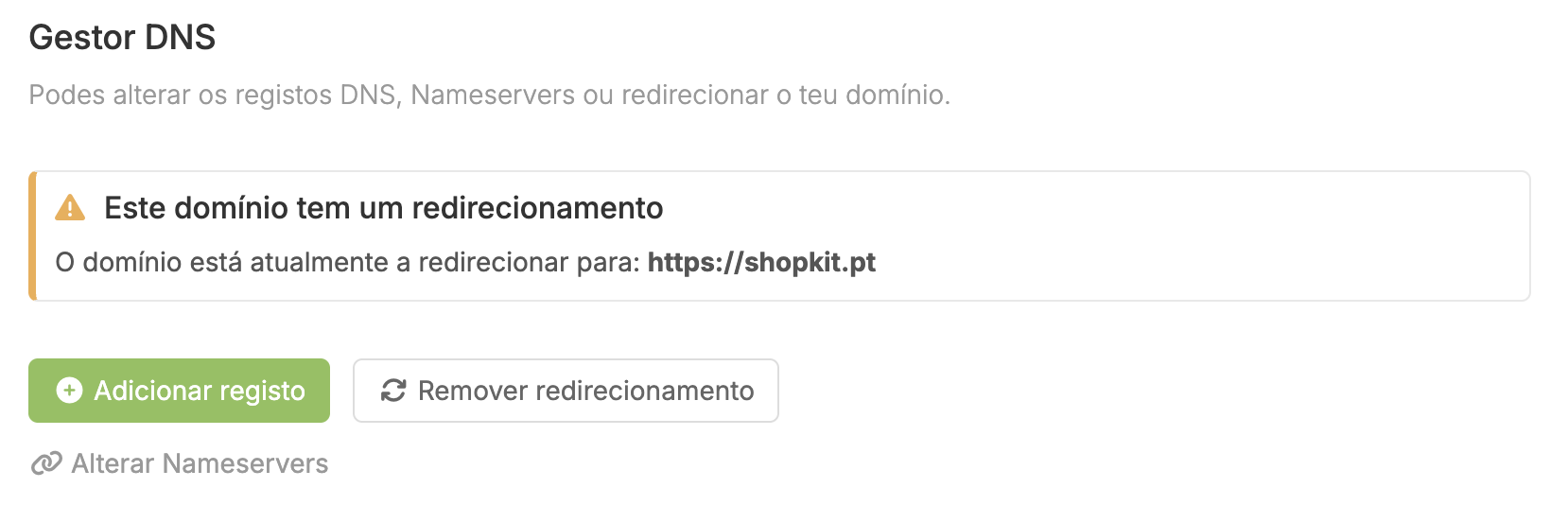 Ao alterares os nameservers, o domínio pode deixar de funcionar como previsto. Isto pode afetar o acesso à loja online e e-mails. A alteração dos nameservers pode ser utilizada caso pretendas ter o domínio próprio alojado num serviço externo à Shopkit, entre outros.