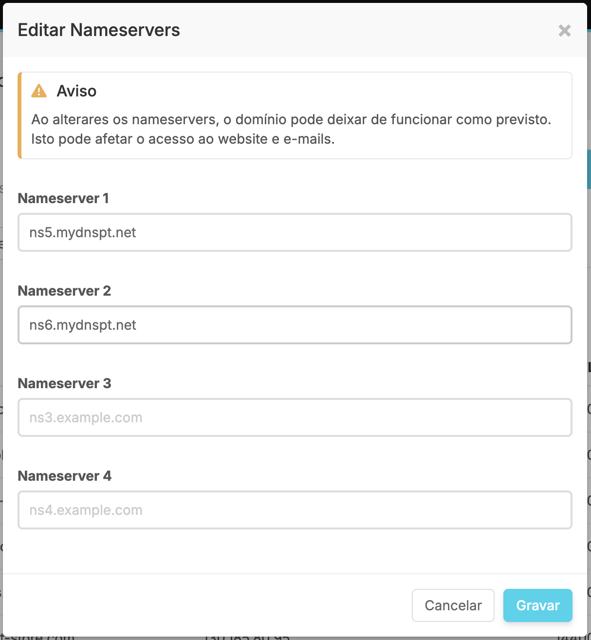 Se pretendes que o teu domínio utilize outros servidores de nomes (nameservers), podes fazê-lo através do botão Alterar Nameservers, disponível no Gestor DNS.