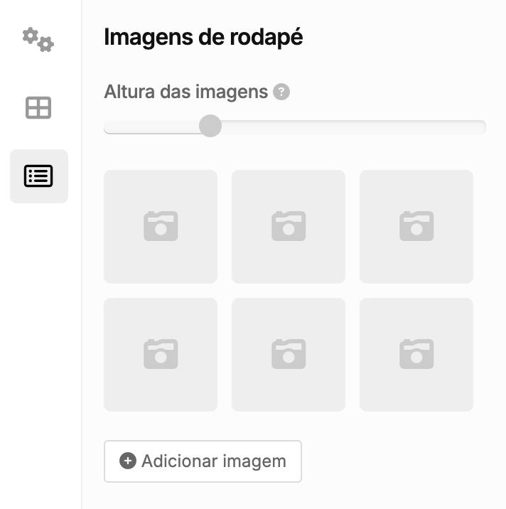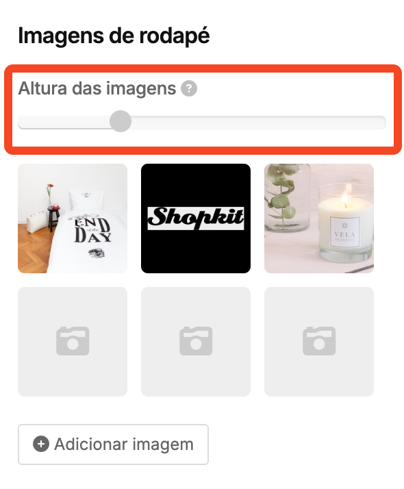 Ao adicionares imagens de rodapé podes definir a altura máxima das imagens, em pixeis, das imagens do rodapé através do slider disponível.