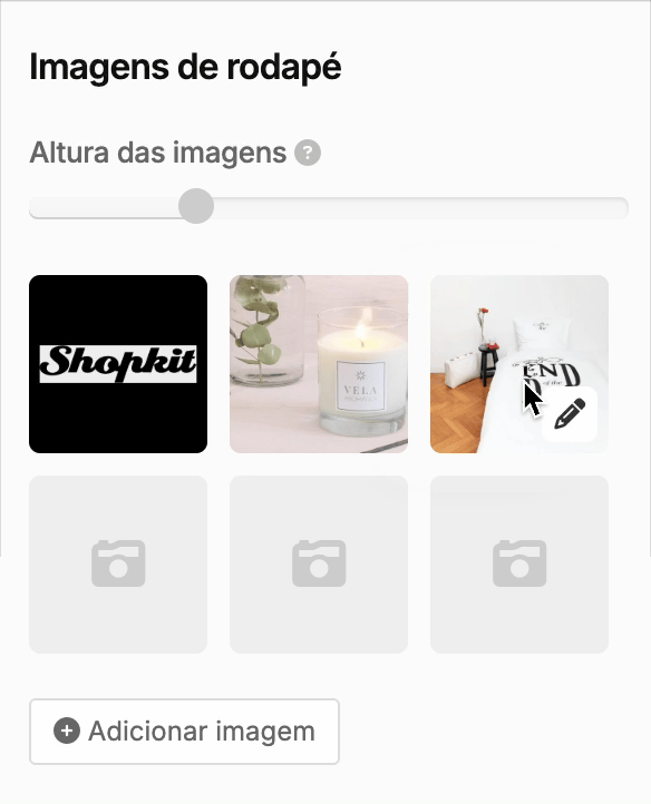 No menu Secções / Rodapé > Imagens de rodapé, do Shopkit Theme Editor, podes alterar a altura das imagens, a sua posição, bem como eliminá-las, caso seja necessário.
