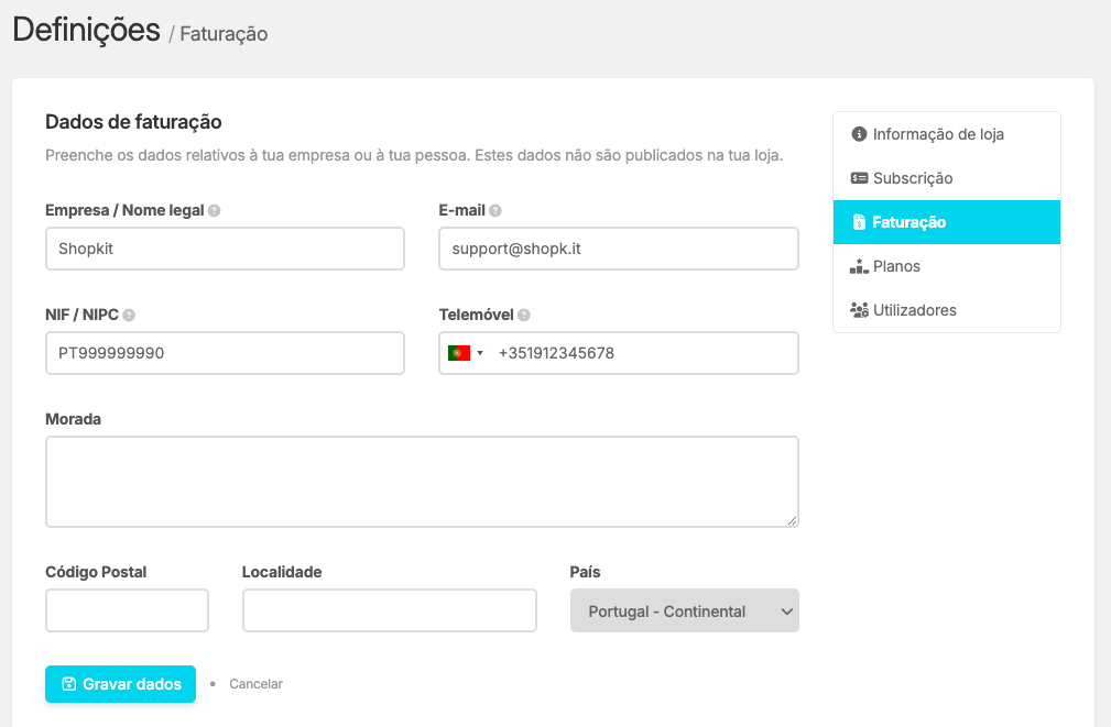 Dados de faturação da loja online