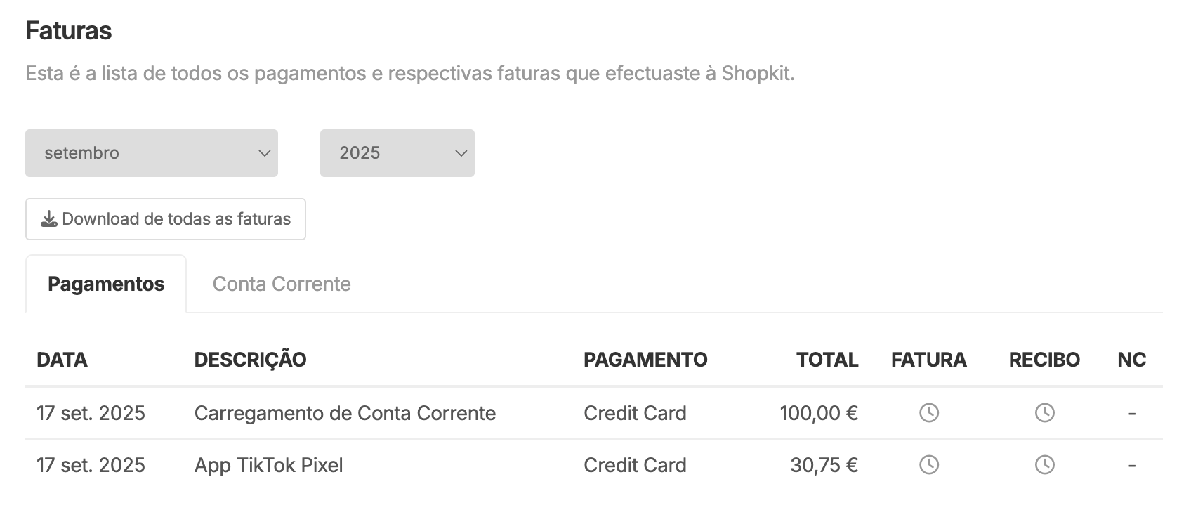 Na secção Faturas podes consultar todos os pagamentos e as respetivas faturas emitidas pela Shopkit.