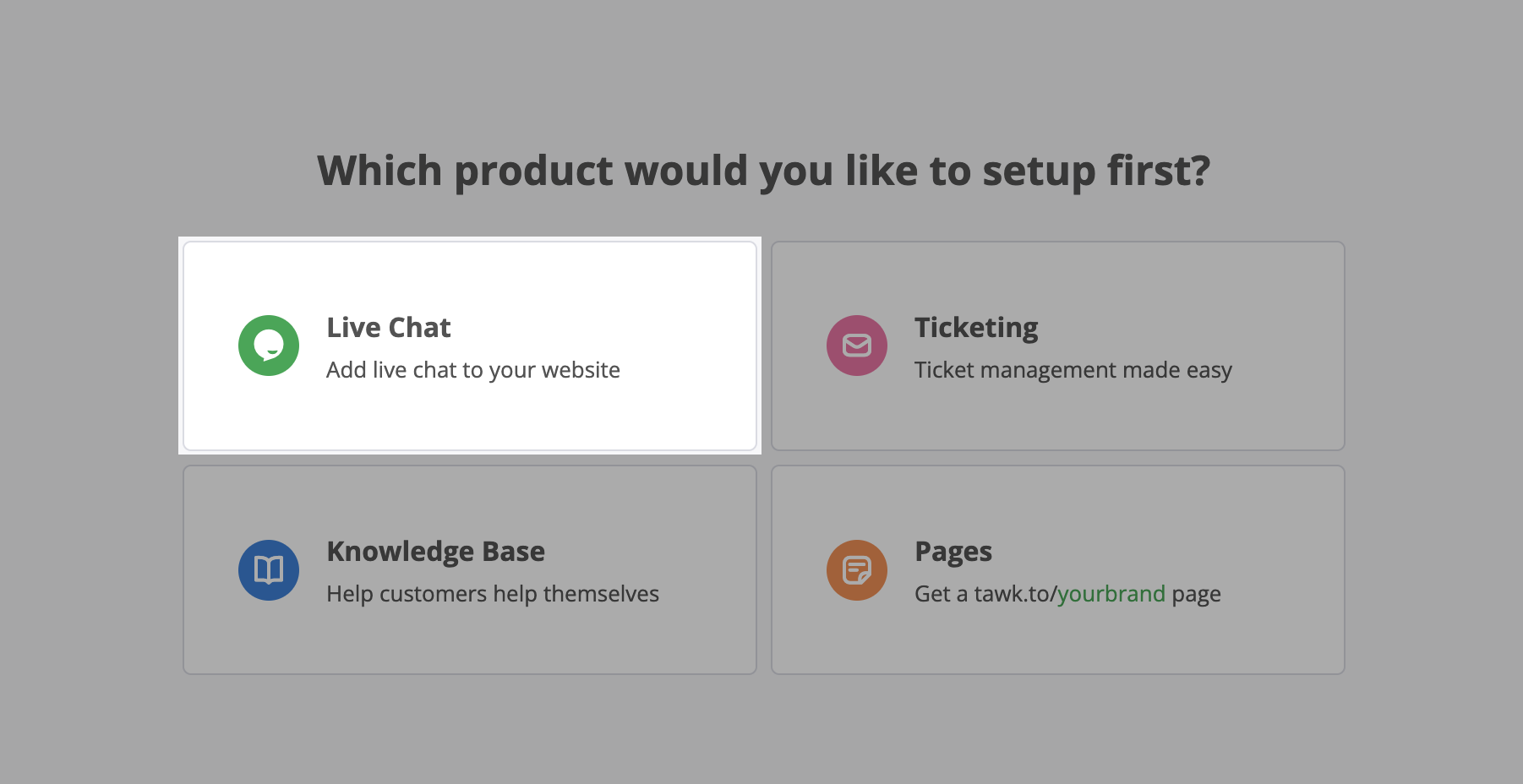 Ao acederes à tua conta no Tawk, surgem quatro opções disponíveis e, para criares o chat online, deves selecionar a opção Live Chat.