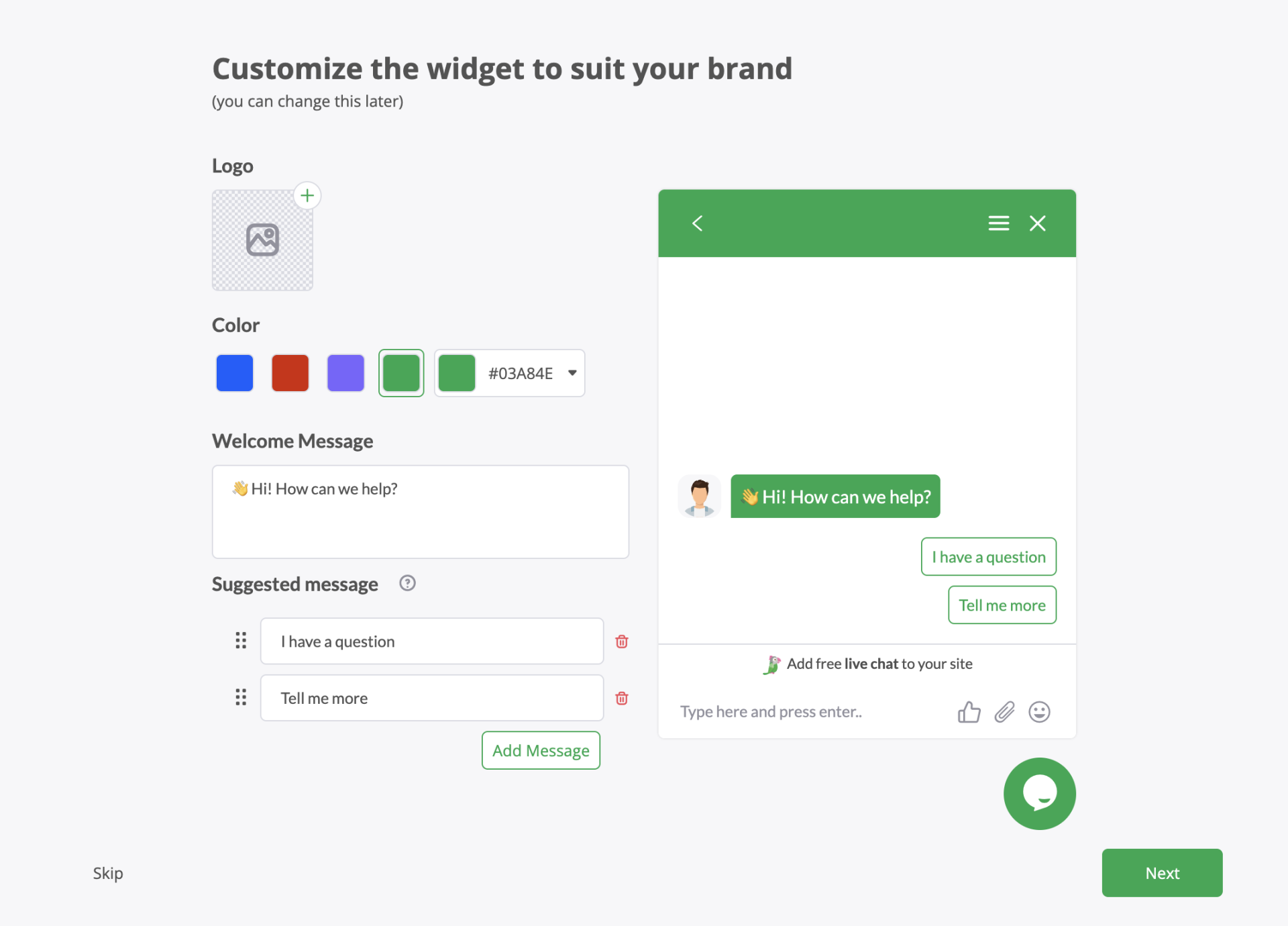 De seguida, podes configurar a aparência do chat online para que fique personalizado para a tua loja online. Podes definir o logótipo do chat, a cor, uma mensagem de boas-vindas e sugestões de mensagens iniciais.