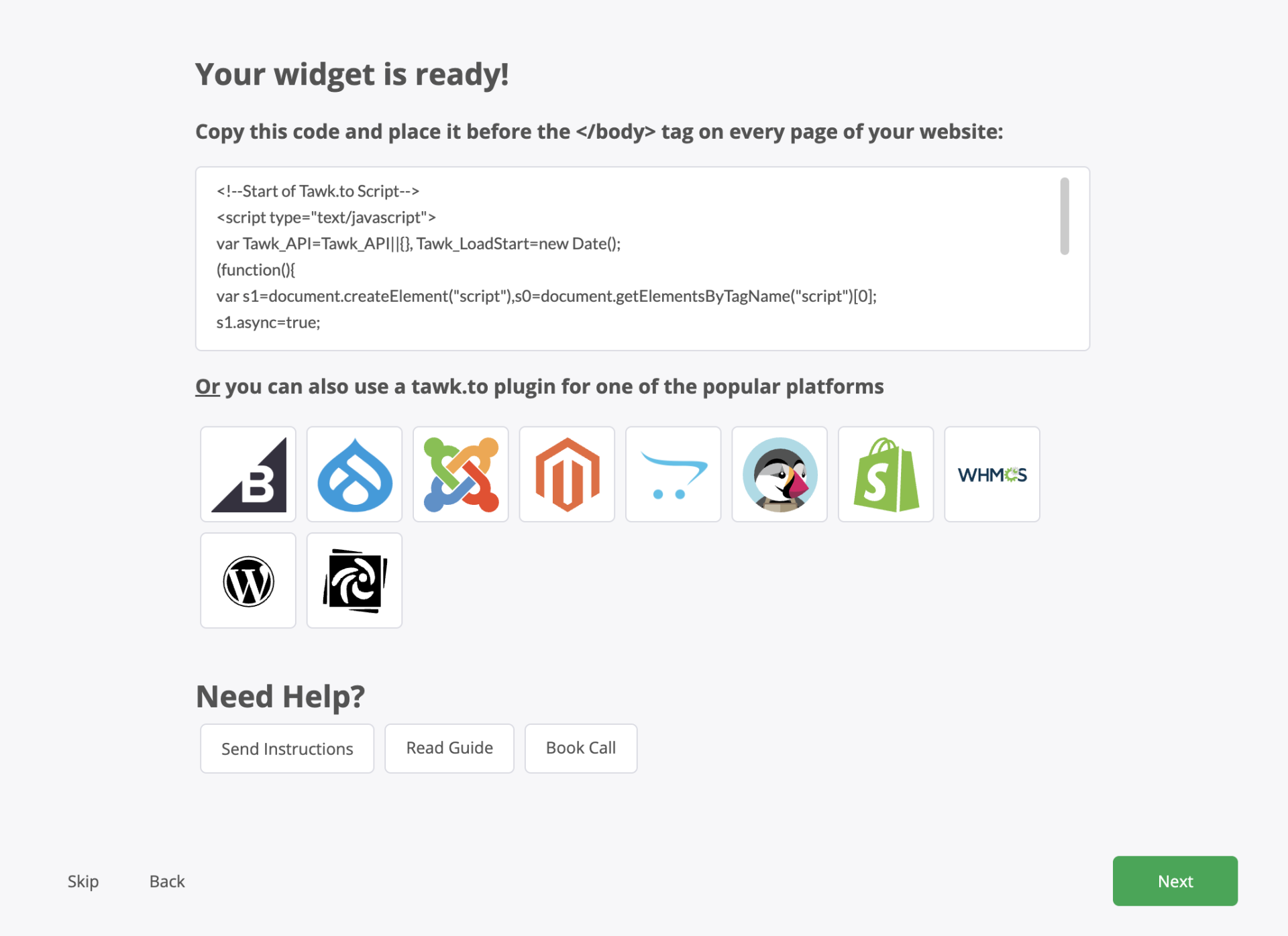 Após gravares os dados na app Tawk na tua área de gestão, deves voltar à tua conta na plataforma Tawk e clicar no botão Next.