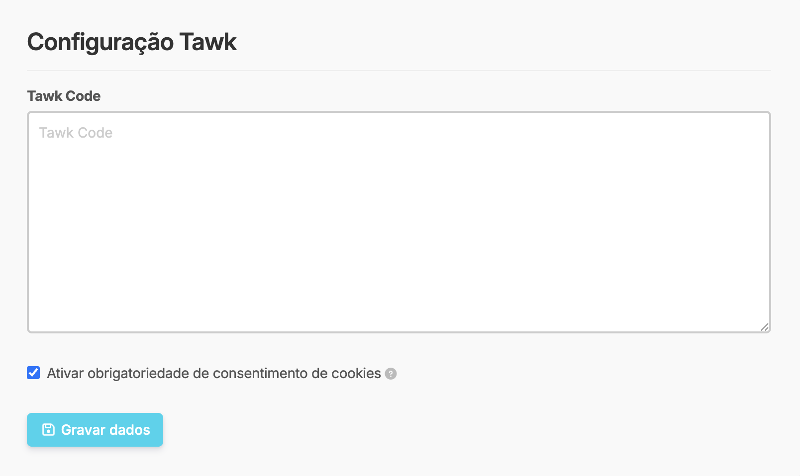 Ao obteres o código para a instalação do chat online, deves inseri-lo no campo Tawk Code, nos detalhes da app Tawk.