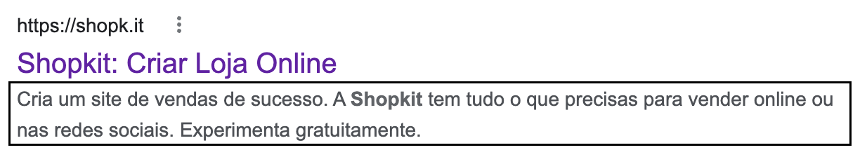 A meta description não é um fator considerado no algortimo do Google, mas tem um papel importante numa estratégia de SEO. Trata-se de um resumo da página que pode ser lido diretamente nos resultados encontrados numa pesquisa no motor de busca. Pode ser determinante na decisão do utilizador em clicar ou não para aceder à página. Abaixo podes verificar um exemplo da meta description: