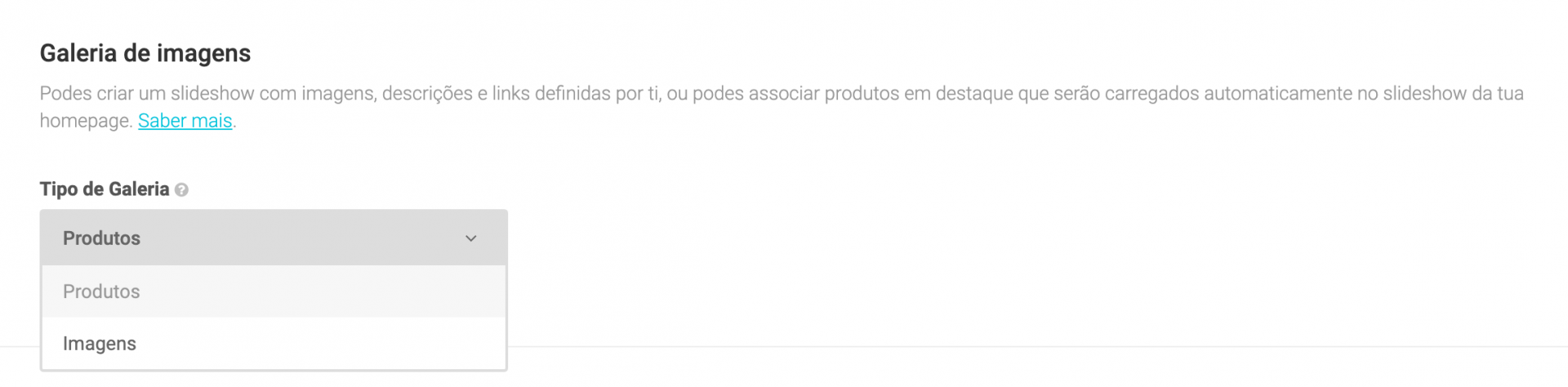 No campo Tipo de Galeria, ao seleccionares a opção Produtos, os produtos em destaque da tua loja vão surgir também no slideshow. Para gerires a galeria de imagens da tua loja, sugerimos este artigo de suporte.