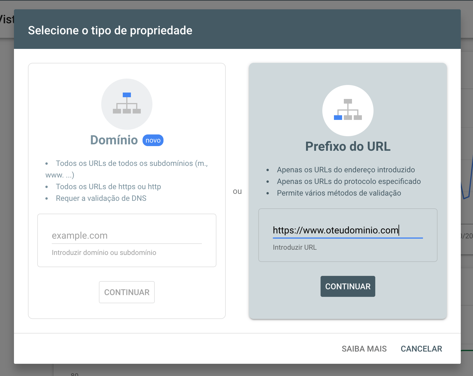 O primeiro passo é escolher o domínio que pretendes indexar e monitorizar no Google. Podes escolher entre dois tipos de propriedade: Domínio ou Prefixo de URL. Escolhe a opção Prefixo do URL e insere o domínio primário da tua loja online.