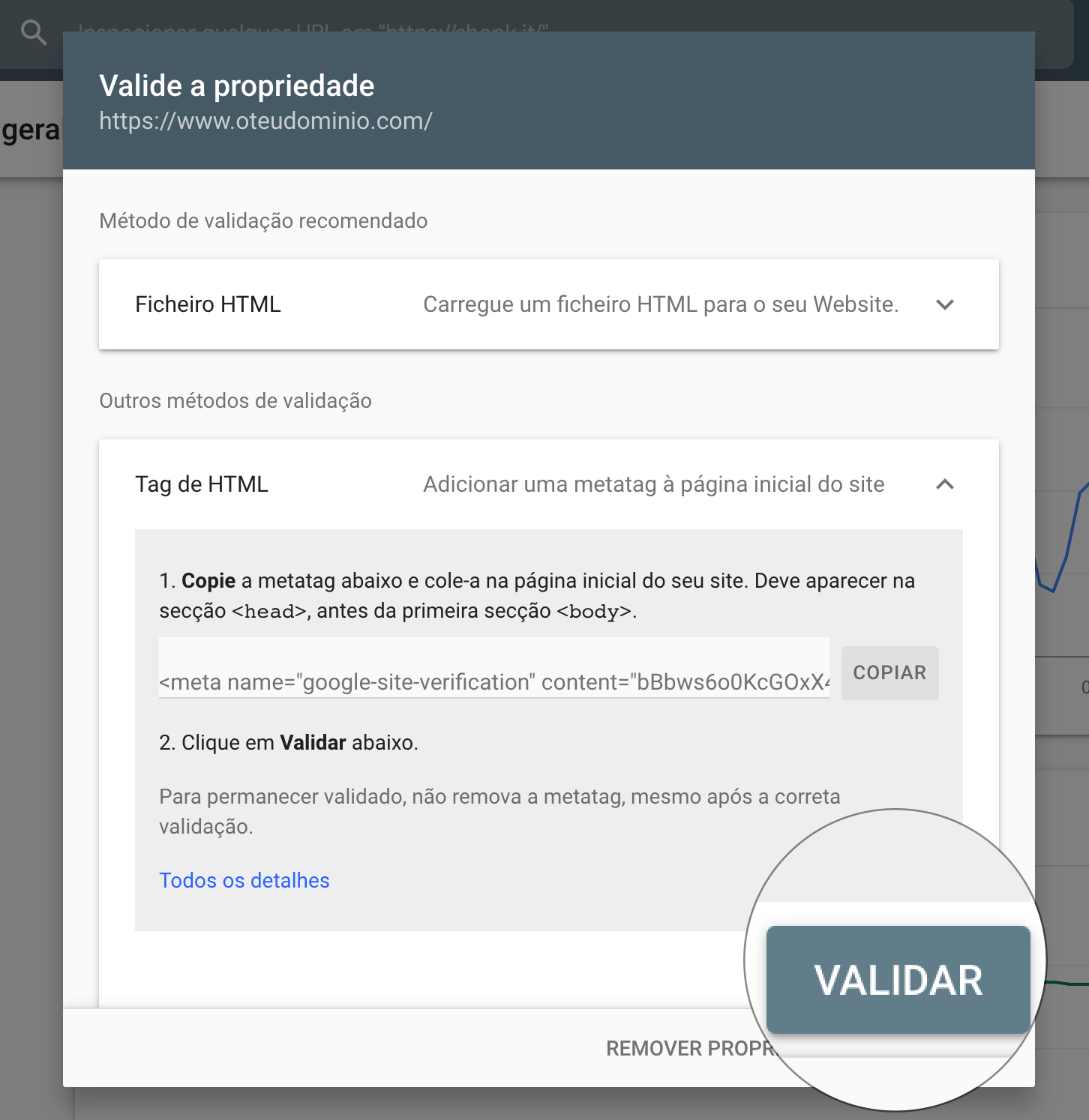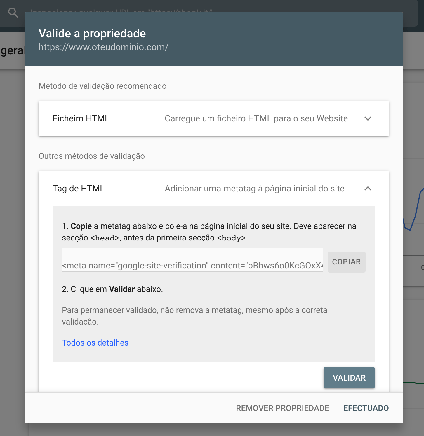 Depois de introduzires o URL, clica em Continuar. De seguida, surgirá uma janela com vários métodos de validação da propriedade. Deves optar pelo método de validação Tag de HTML e clicar para ver mais detalhes.