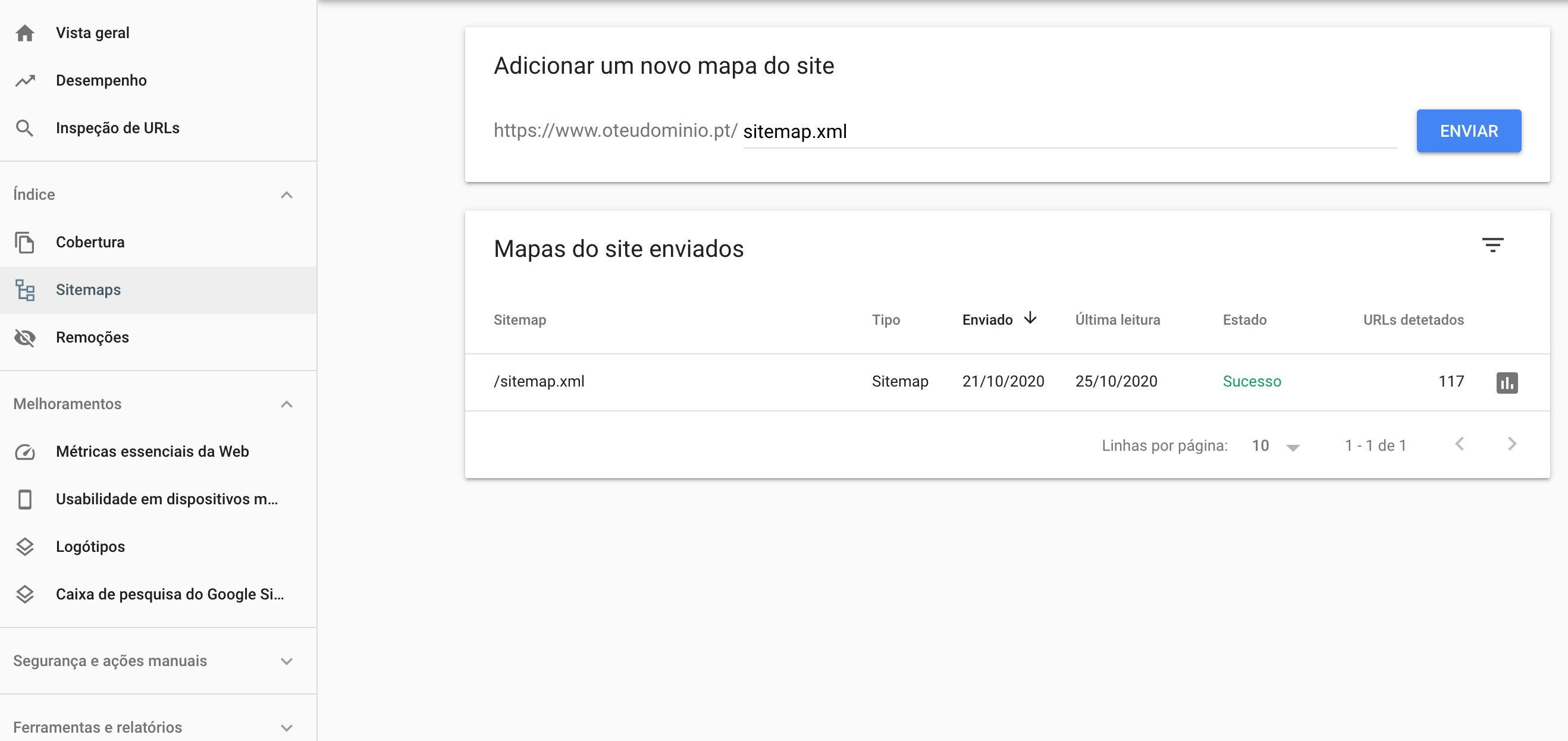 Para fazeres o envio do sitemap no Google Search Console, acede à ferramenta e, na barra de navegação lateral, clica em Sitemaps. No campo Adicionar um novo mapa do site escreve sitemap.xml e clica em Enviar.