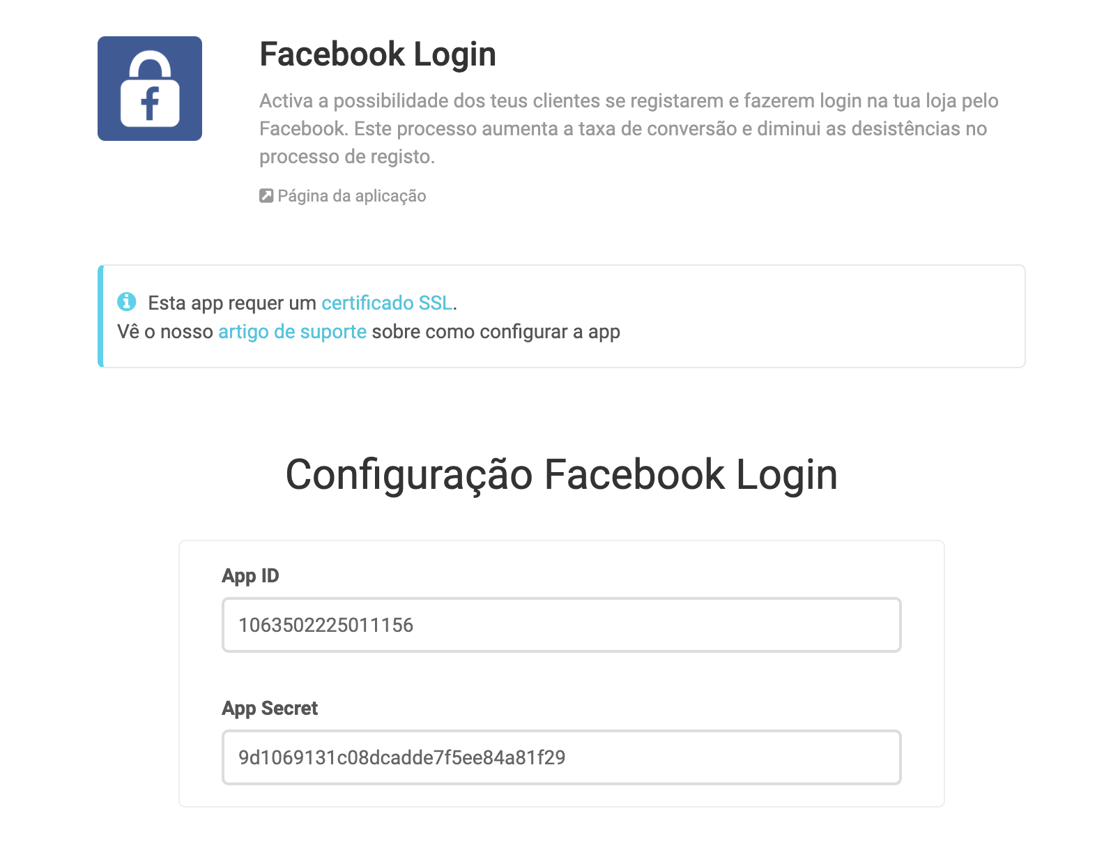 Depois de copiares o App ID e App Secret, deves inseri-los nos respetivos campos na app Facebook Login, na área de gestão da loja (menu Apps / Social). Exemplo: