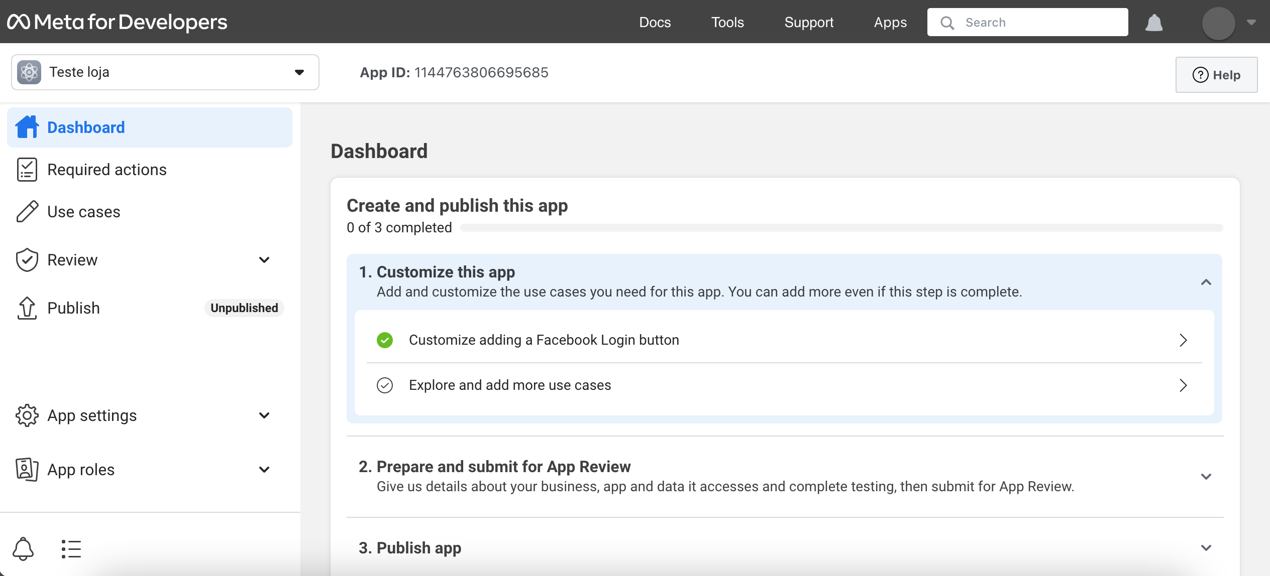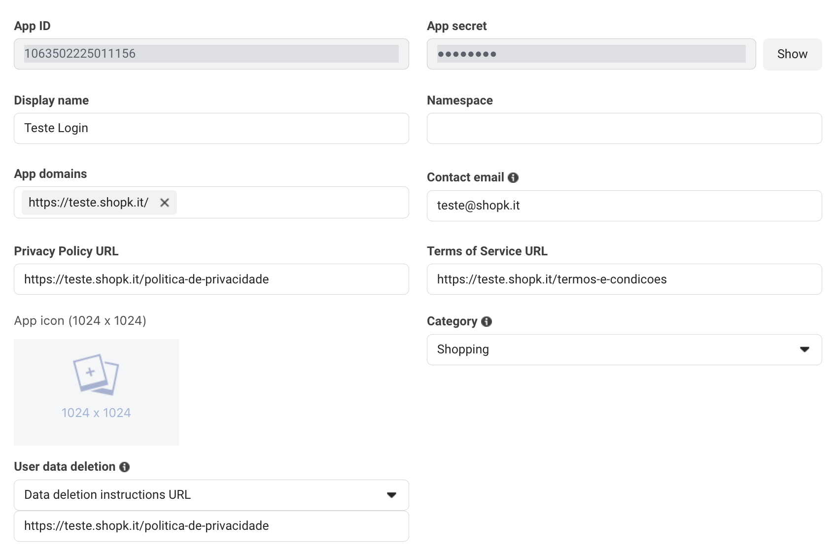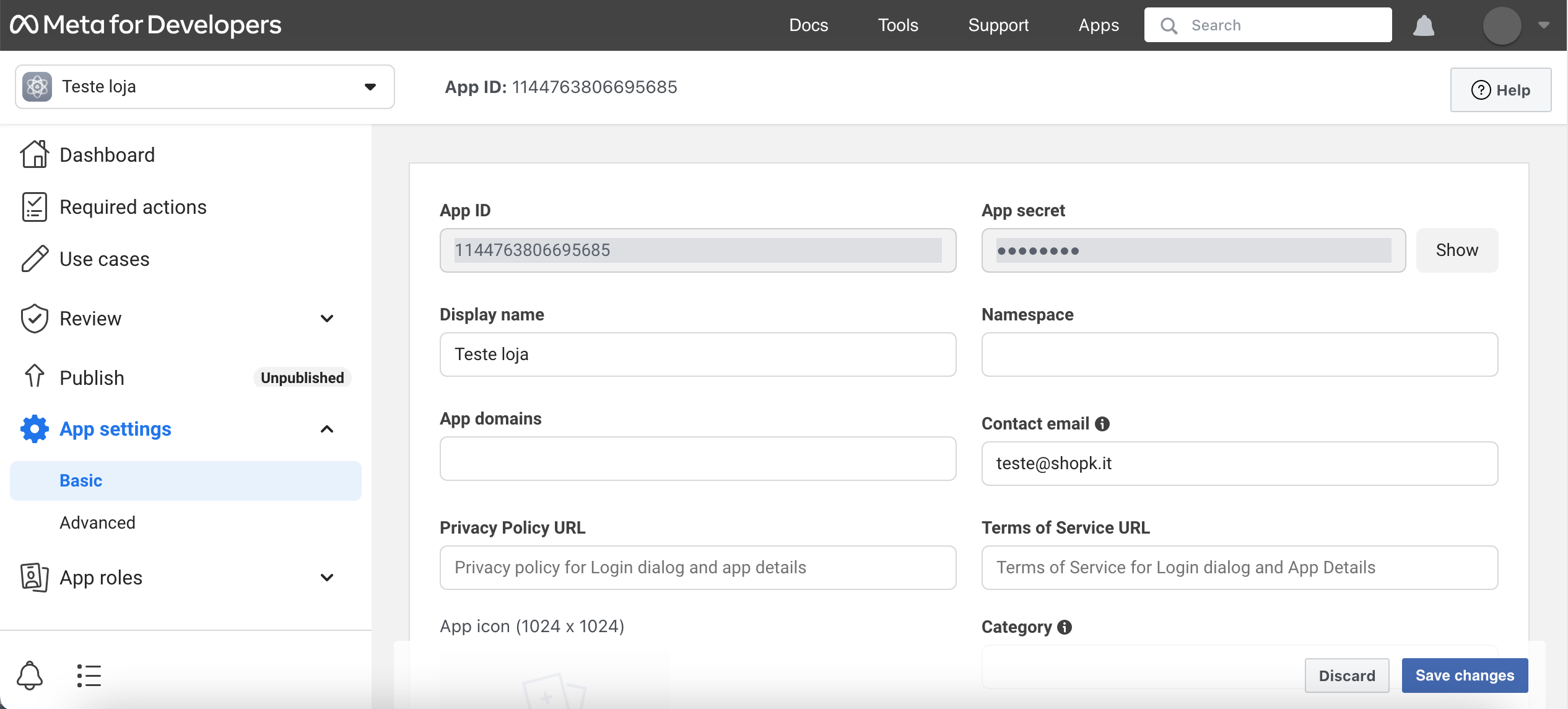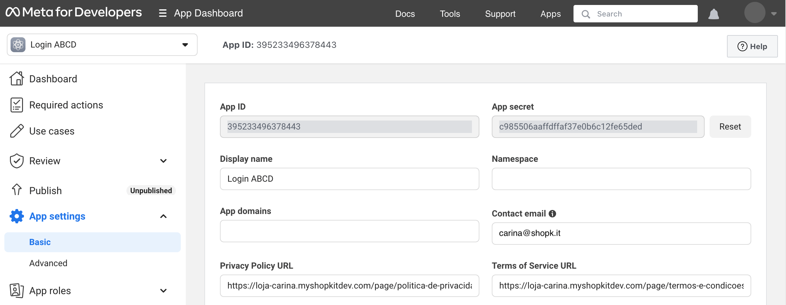Depois de publicares a app tens acesso ao App Secret, que será necessário para a configuração da app Facebook Login na área de gestão da loja. Vais também precisar do App ID, que surge visível nos detalhes da app criada no Meta for Developers.