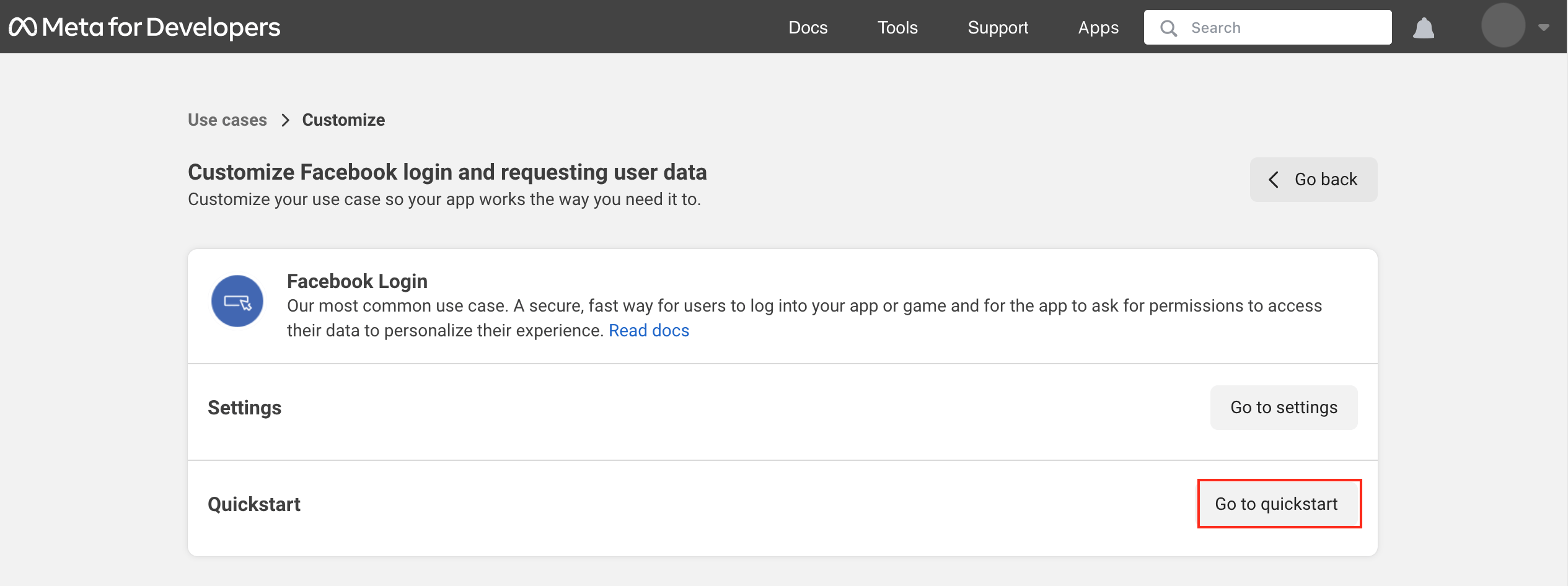 Para continuares a configurar a app Facebook Login, no separador Dashboard acede ao primeiro passo e clica em Customize adding a Facebook Login button. De seguida, clica em Go to Settings.