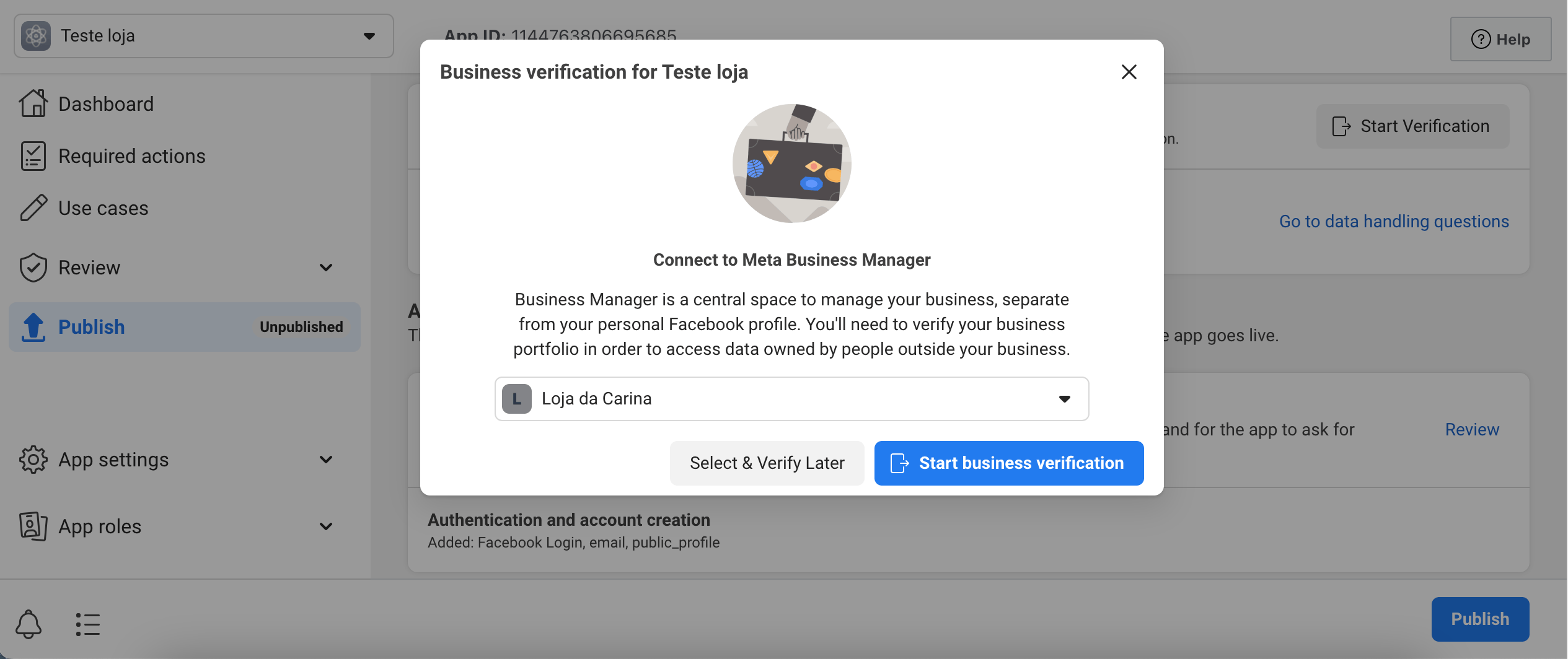 Ter o negócio verificado é necessário para que possas continuar a configurar a app Facebook Login e para a colocares live.