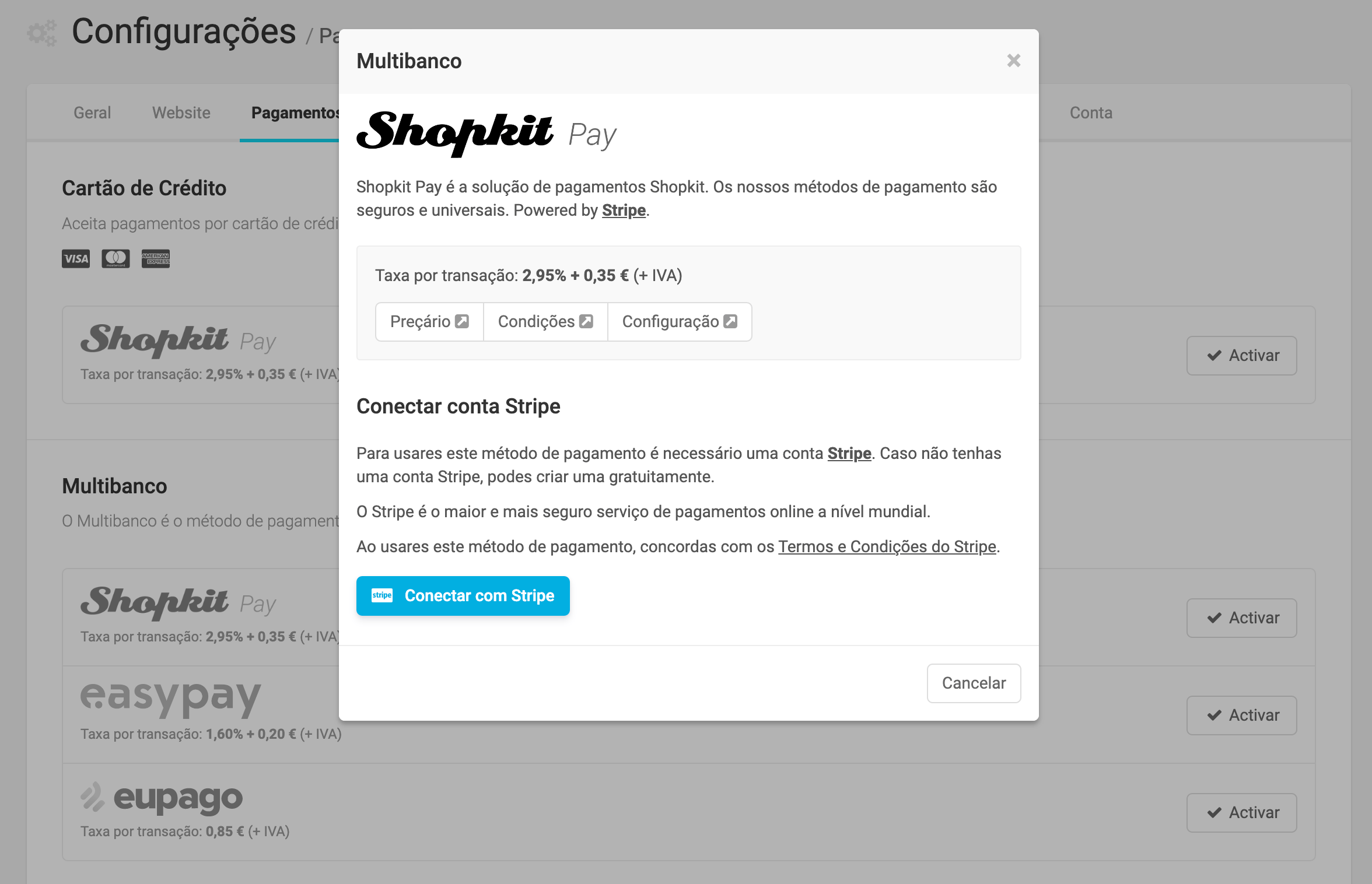 Acede ao menu Configurações / Pagamento clica no botão Activar no método Multibanco Shopkit Pay e, de seguida, clica em Conectar com Stripe.