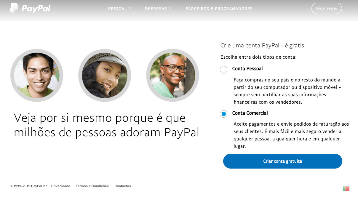 Criar conta PayPal Comercial.