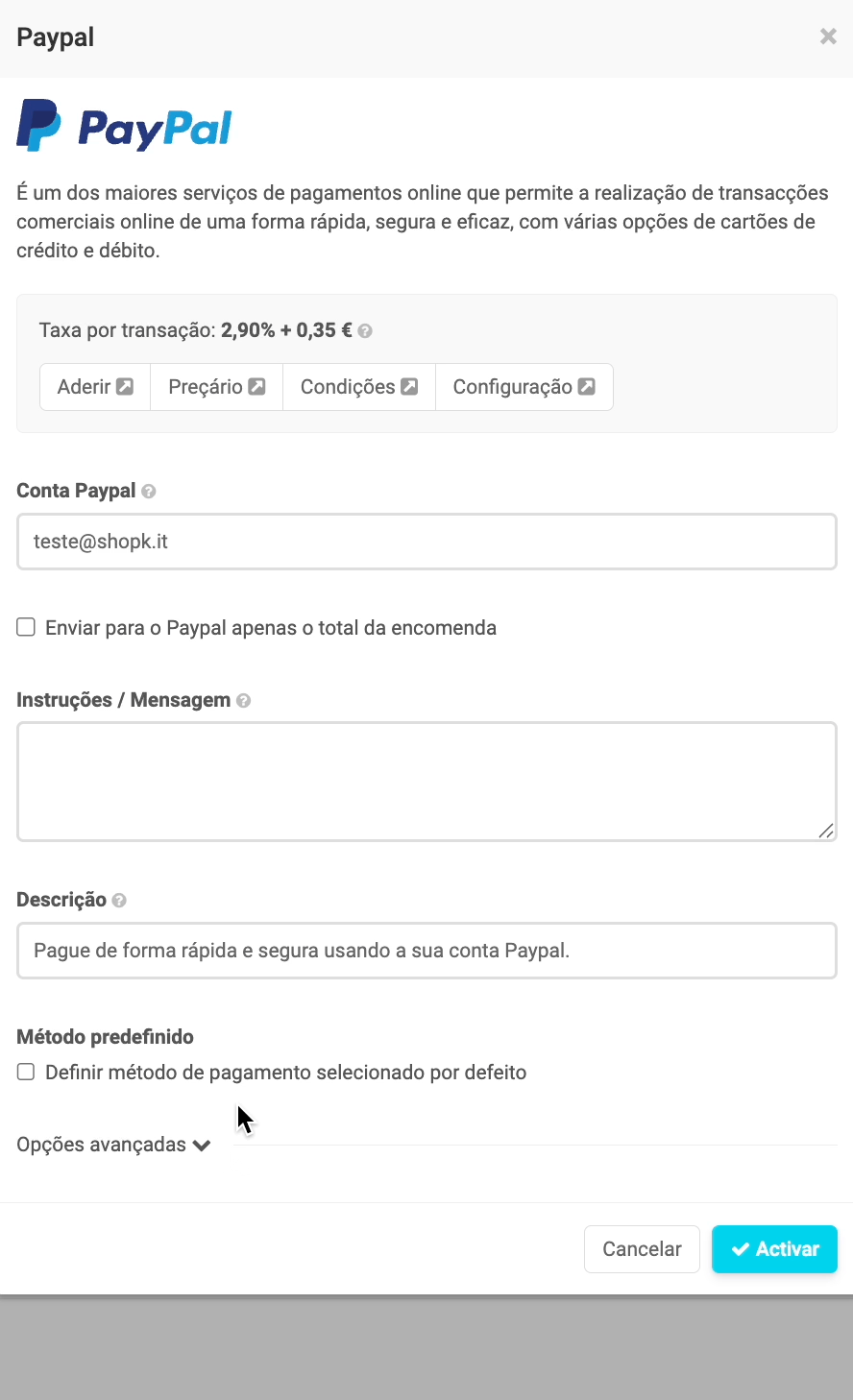 Para poderes usar este método de pagamento é necessário uma conta PayPal.