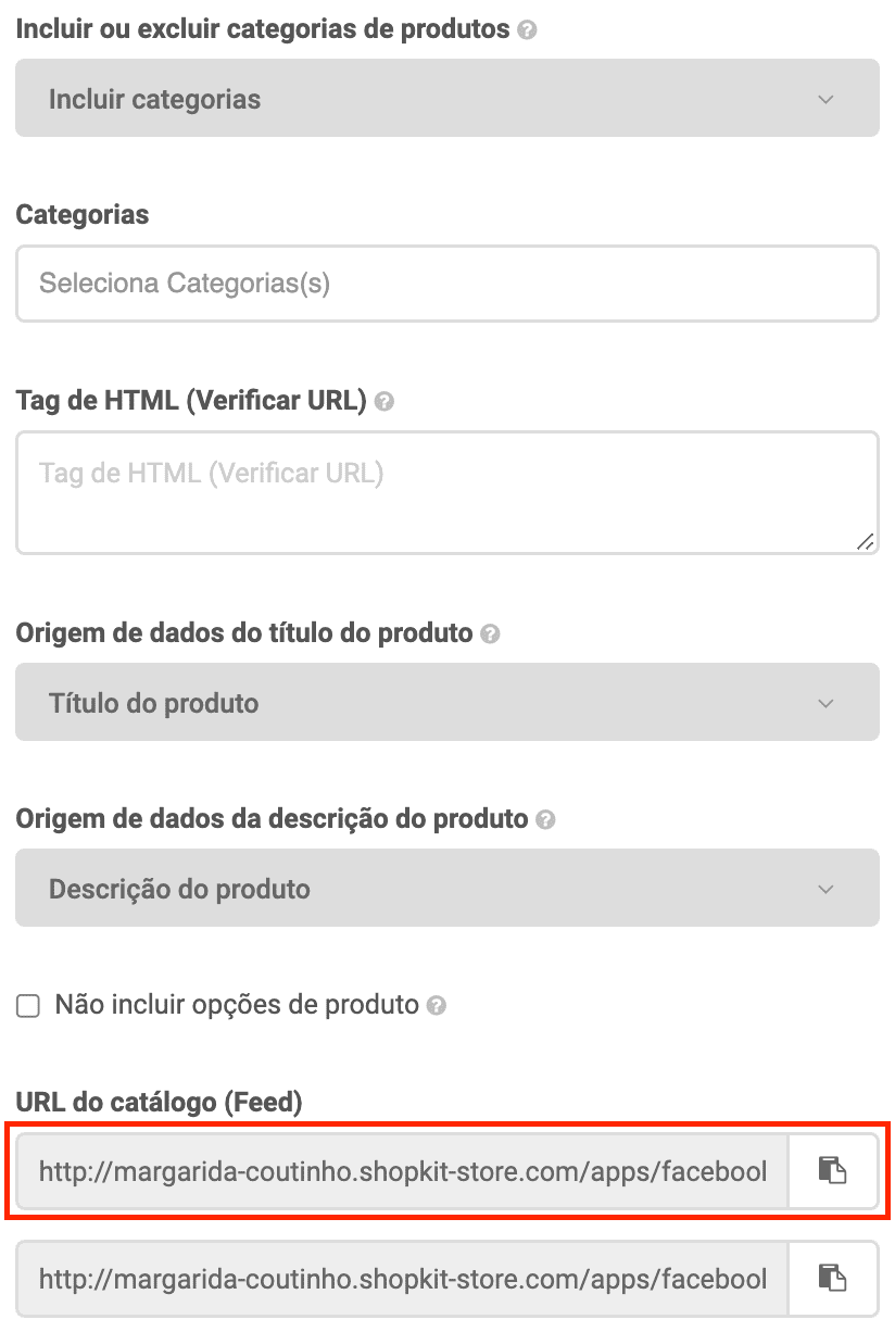 Com a opção Não incluir opções de produto selecionada, cada URL contém até 500 produtos sem opções. Com a opção selecionada, cada URL inclui um máximo de 50 produtos e as respetivas variações, pelo que a quantidade de catálogos a importar será maior do que na situação anterior.