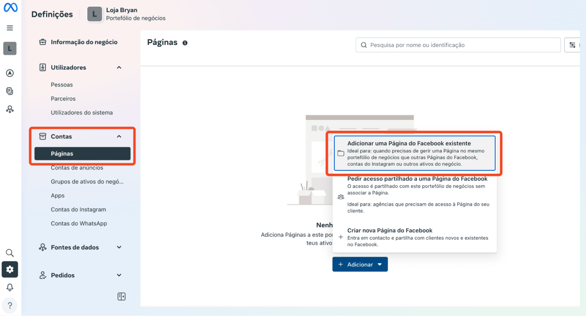 4. Clica em Adicionar e depois na opção Adicionar uma Página do Facebook existente.