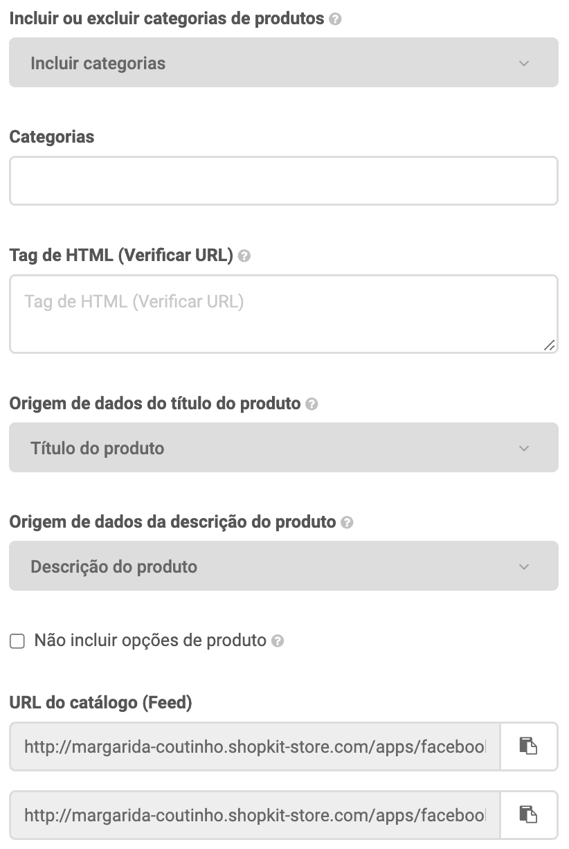 Este filtro permite definir a forma como o catálogo de produtos é importado. Podes optar por criar um feed de produtos que inclui ou exclui determinadas categorias da tua loja.
