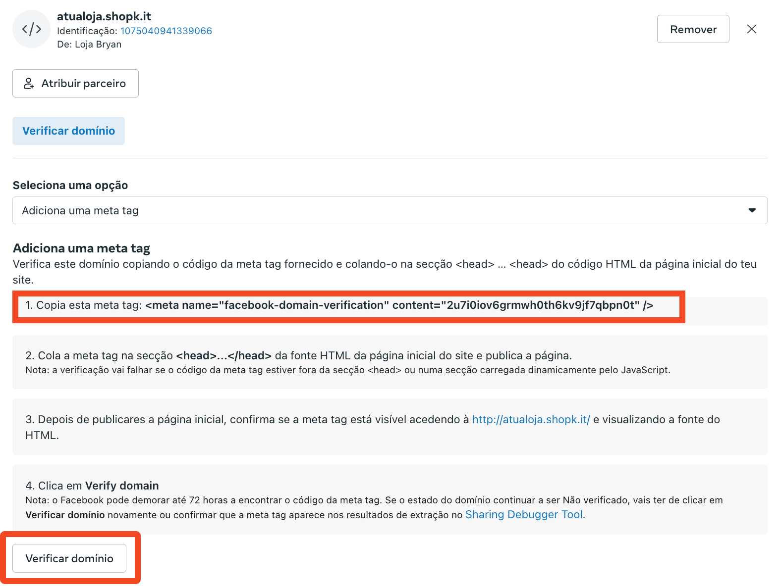 Seleciona a opção Adicionar uma meta-tag ao teu código fonte HTML e copia a meta-tag que te é fornecida no ponto 1: