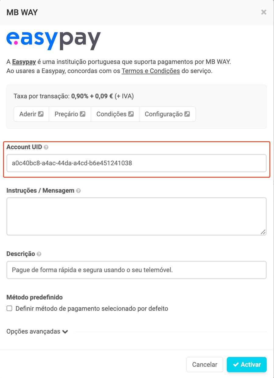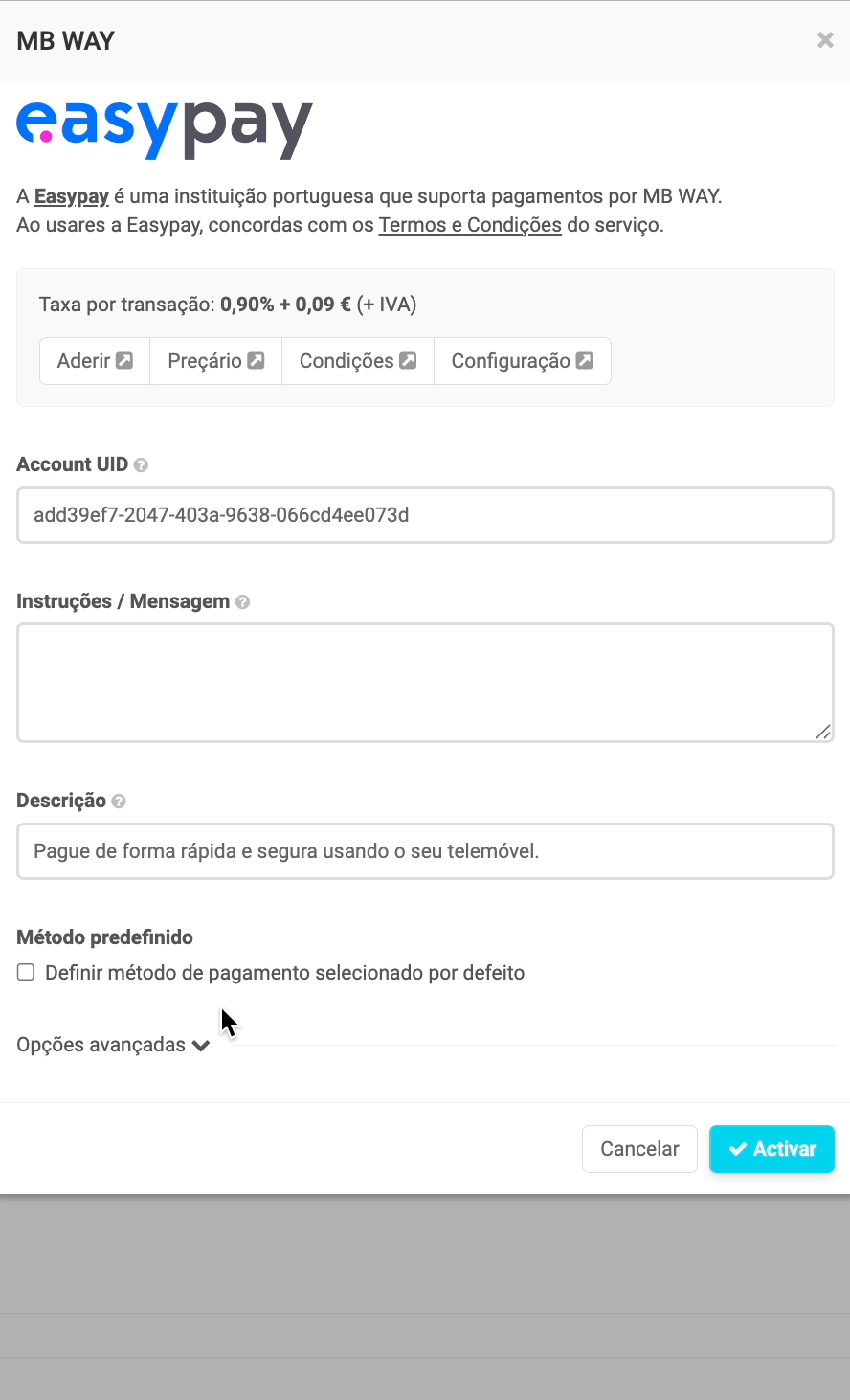 A taxa de transação aplicada nos pagamentos por MB Way via Easypay é de 0,9% + 0,09 € (+IVA).